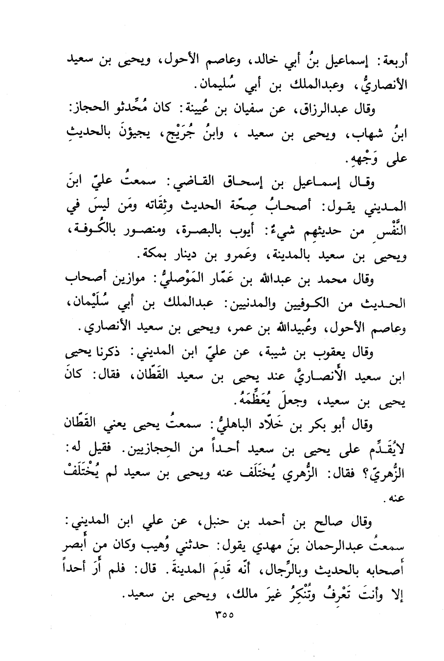 وَقَال صَالِح بْن أَحْمَد بن حنبل، عن علي ابن المديني: سمعت عبد الرحمن بن مَهْدِيّ يَقُول: حَدَّثَنِي وهيب وكَانَ من أبصر أصحابه بالحديث وبالرجال، أنه قدم المدينة قال: فلم أر أحدا إلا وأنت تعرف وتنكر غير مَالِك، ويحيى بْن سَعِيد.