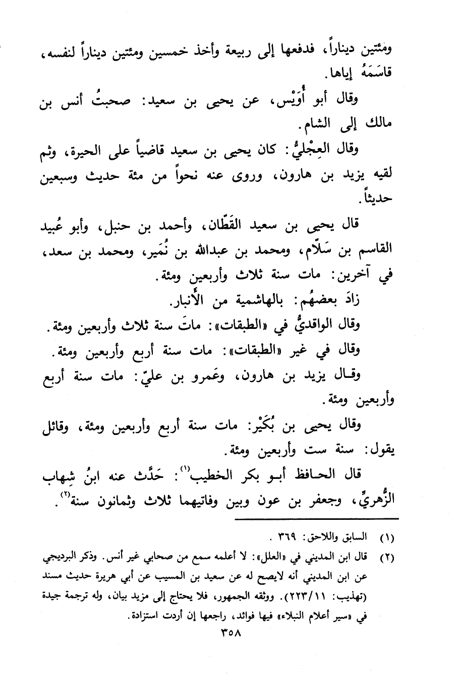 (2) قال ابن المديني في " العلل": لا أعلمه سمع من صحابي غير أنس. وذكر البرديجي عن ابن المديني أنه لا يصح له عَنْ سَعِيد بْن المُسَيَّب عَن أبي هُرَيْرة حديث مسند (تهذيب: 11 / 223) ووثقه الجمهور، فلا يحتاج إلى مزيد بيان، وله ترجمة جيدة في " سير أعلام النبلاء" فيها فوائد، راجعها إن أردت استزادة.