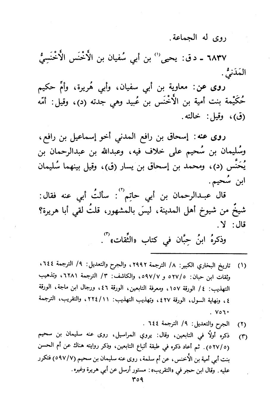 6837 - د ق: يَحْيَى بن أَبي سُفْيَان بن الأَخْنَس الأخنسي المدني (1) .