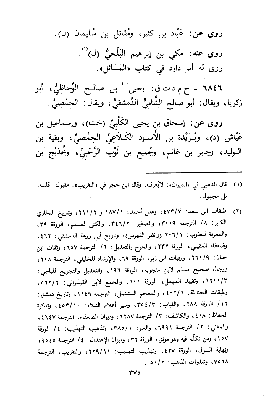 6846 - ح م د ت ق: يَحْيَى بن صَالِح الوحاظي (2) ، أَبُو زكريا، ويُقال: أَبُو صَالِح الشامي الدمشقي، ويُقال: الحمصي.