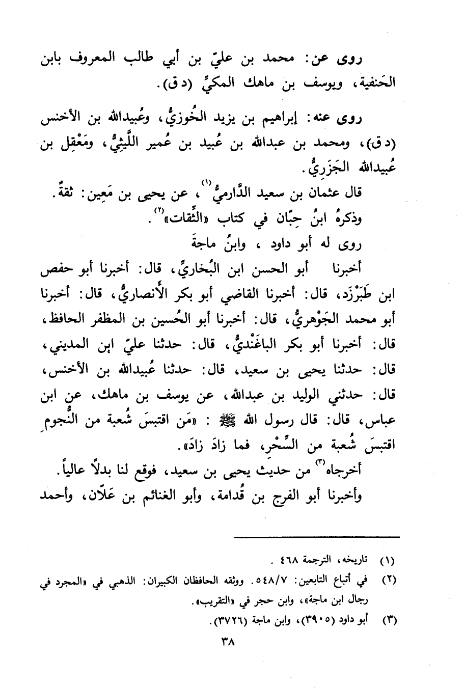 أخبرنا أَبُو الْحَسَنِ بْنُ البخاري، قال: أَخْبَرَنَا أبو حفص ابن طَبَرْزَذَ، قال: أخبرنا الْقَاضِي أَبُو بَكْرٍ الأَنْصارِيّ، قال: أخبرنا أَبُو مُحَمَّدٍ الجوهري، قال: أخبرنا أَبُو الحسين بْن المظفر الحافظ، قال: أخبرنا أَبُو بَكْر الْبَاغَنْدِيُّ، قال: حَدَّثَنَا علي ابن الْمَدِينِيِّ، قال: حَدَّثَنَا يَحْيَى بْنُ سَعِيد، قال: حَدَّثَنَا عُبَيد اللَّهِ بْنُ الأَخْنَسِ، قال: حَدَّثَنِي الْوَلِيدُ بْنُ عَبد اللَّهِ، عَنْ يُوسُفَ بْنِ مَاهَكَ، عَنِ ابْنِ عَبَّاسٍ، قال: قال رَسُولُ اللَّهِ صلى الله عليه وسلم: مَنِ اقْتَبَسَ شُعْبَةً مِنَ النُّجُومِ اقْتَبَسَ شُعْبَةً مِنَ السِّحْرِ، فَمَا زَادَ زَادَ.