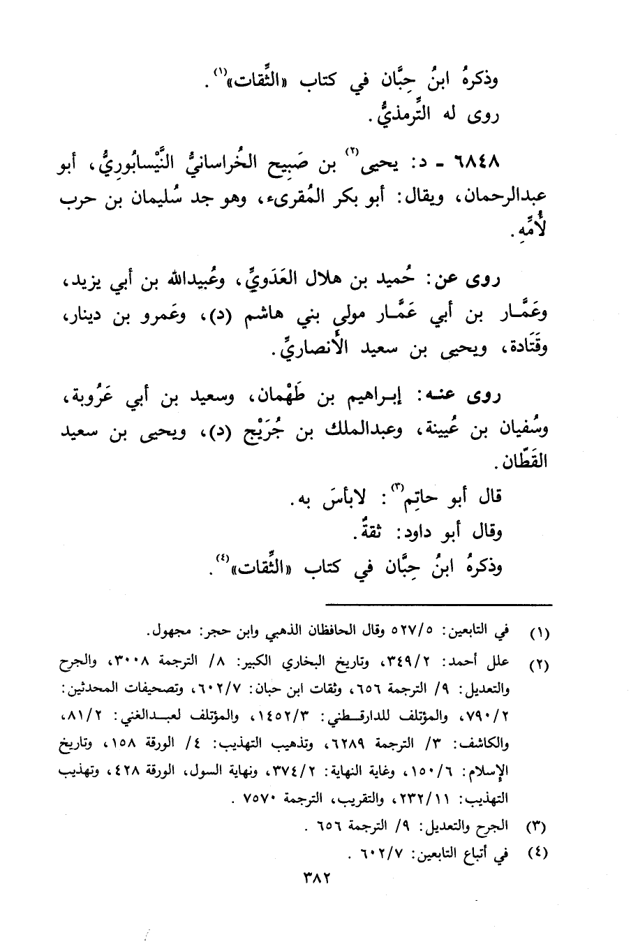6848 - د: يَحْيَى بن صبيح الخراساني النيسابوري (2) ، أبو عَبْد الرحمن، ويُقال: أبو بَكْر المقرئ، وهُوَ جد سُلَيْمان بْن حرب لأمه.