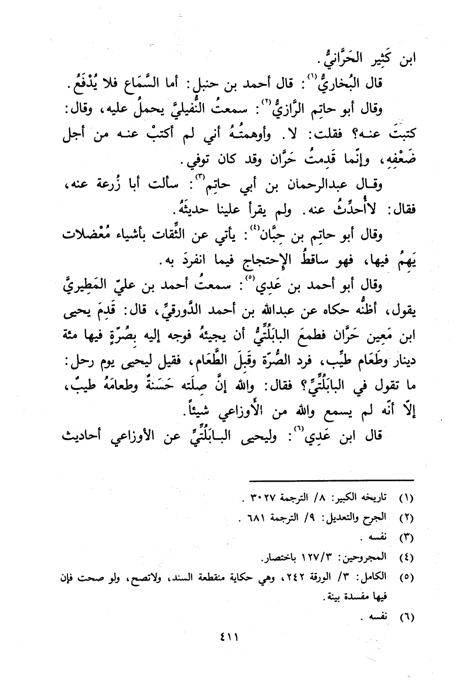 وَقَال أَبُو حاتم الرازي (2) : سمعت النفيلي يحمل عليه، وَقَال: كتبت عنه؟ فقلت: لا وأوهمته أني لم أكتب عنه من أجل ضعفه، وإنما قدمت حران وقد كَانَ توفي.