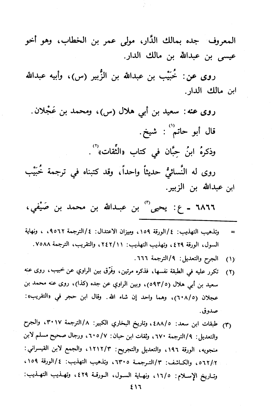 (2) تكرر عليه في الطبقة نفسها، فذكره مرتين، وفرق بين الراوي عن خبيب، روى عنه سَعِيد بْن أَبي هلال (5 / 593) ، وبين الراوي عن جده (كذا) ، روى عنه مُحَمَّد بْن عجلان (5 / 608) ، وهما واحد إن شاء الله وَقَال ابن حجر في "التقريب": صدوق.
