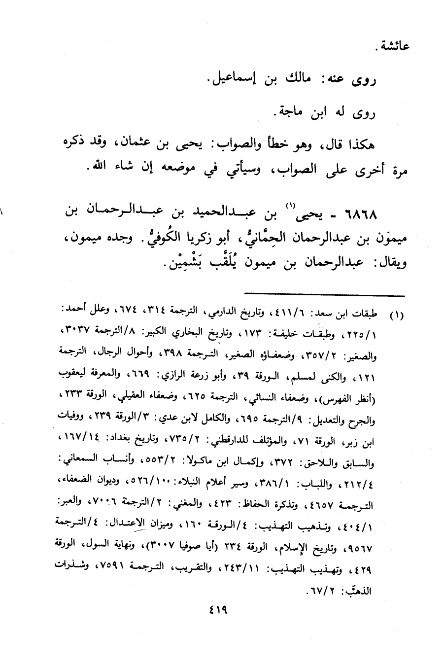 6868 - يحيى بن عبد الحميد بن عَبْد الرَّحْمَنِ بن مَيْمُون بن عَبْدِ الرَّحْمَنِ الحماني (1) ، أَبُو زكريا الكوفي. وجده مَيْمُون. ويُقال: عَبْد الرَّحْمَنِ بْن مَيْمُون يلقب بشمين.