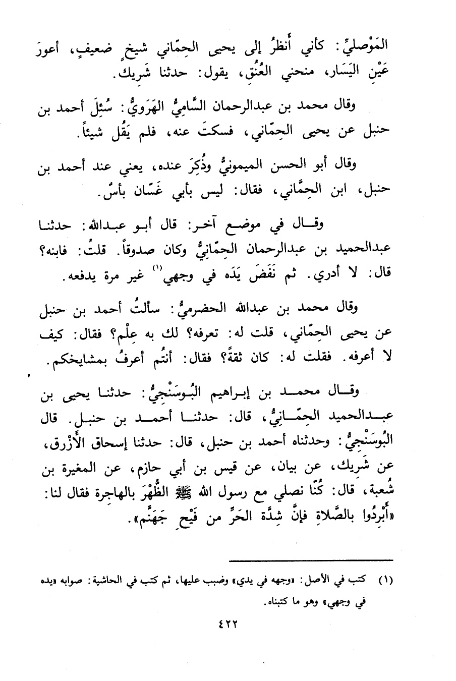 وَقَال مُحَمَّد بْن عَبْد الرَّحْمَنِ السامي الْهَرَوِيّ: سئل أَحْمَد بن حَنْبَلٍ عن يَحْيَى الحماني، فسكت عنه، فلم يقل شيئا.