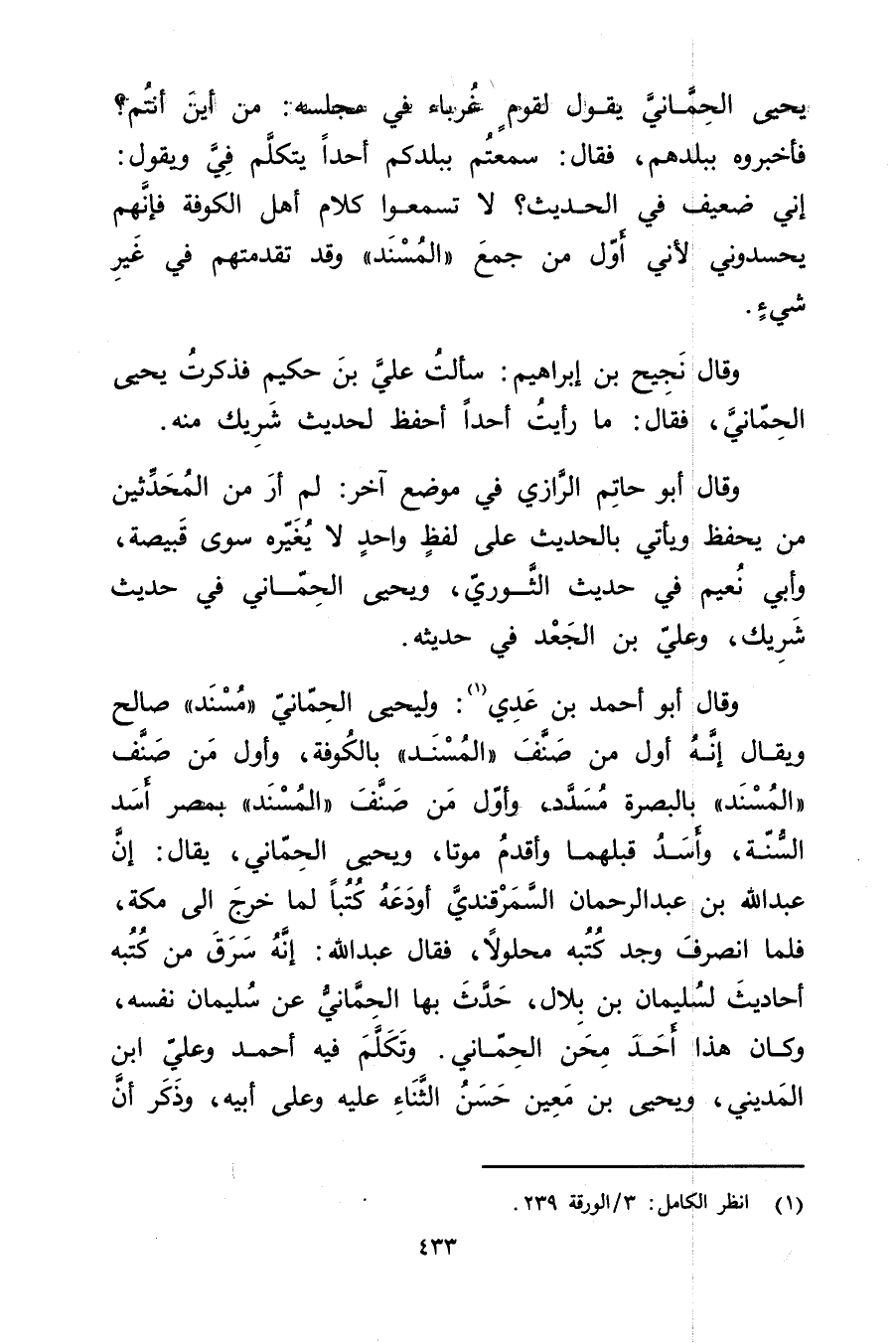 وَقَال أبو أحمد بْن عدي (1) : وليحيى الحماني" مسند" صَالِح ويُقال إنه أول من صنف" المسند" بالكوفة، وأول من صنف" المسند" بالبصرة مسدد، وأول من صنف" المسند" بمصر أسد السنة، وأسد قبلهما وأقدم موتا، ويحيى الحماني، يقال: إن عَبد اللَّهِ بْن عَبْد الرَّحْمَنِ السَّمَرْقَنْدِيّ أودعه كتبا لما خرج إلى مكة، فلما انصرف وجد كتبه محلولا، فَقَالَ عَبد اللَّهِ: إنه سرق من كتبه أحاديث لسُلَيْمان بْن بلال، حدث بها الحماني عَنْ سُلَيْمان نفسه، وكَانَ هذا أحد محن الحماني.