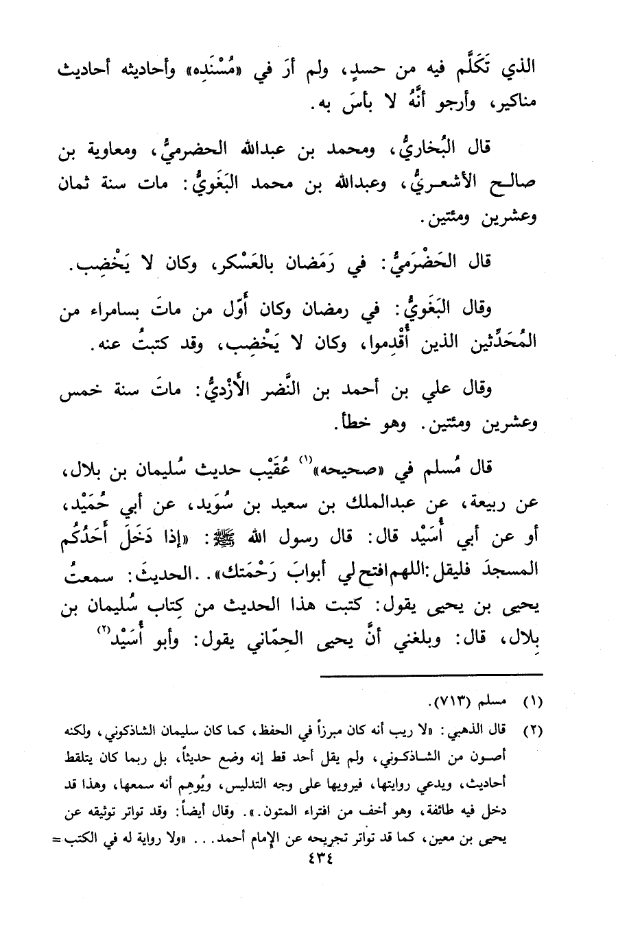 قال مسلم فِي " صحيحه" (1) عقيب حديث سُلَيْمان بْن بلال، عَنْ رَبِيعَة، عَنْ عَبد المَلِك بْن سَعِيد بْن سويد، عَن أَبِي حُمَيْدٍ، أَوْ عَن أَبِي أُسَيْدٍ قال: قال رَسُولُ اللَّهِ صلى الله عليه وسلم: إِذَا دَخَلَ أَحَدُكُمُ الْمَسْجِدَ فَلْيَقُلْ: اللَّهُمَّ افْتَحْ لِي أَبْوَابَ رَحْمَتِكَ" الحديث: سمعت يَحْيَى بْن يَحْيَى يَقُول: كتبت هذا الحديث من كتاب سُلَيْمان بْن بلال، قال: وبلغني أن يَحْيَى الحماني، يَقُول: وأبو أسيد (2)