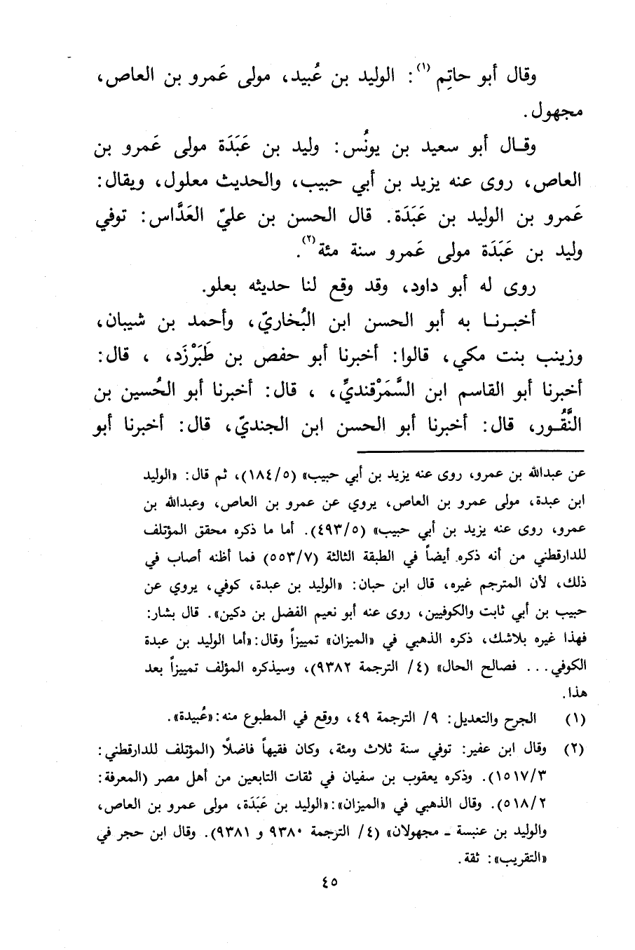 (2) وَقَال ابن عفير: توفي سنة ثلاث ومئة، وكان فقيها فاضلا (المؤتلف للدارقطني: 3 / 1517) ، وذَكَره يعقوب بن سفيان في ثقات التابعين من أهل مصر (المعرفة: 2 / 518) وَقَال الذهبي في " الميزان": الوليد بن عبده" مولى عَمْرو بن العاص، والوليد بن عنبسة - مجهولان" (4 / الترجمة 9380 و9381) . وَقَال ابن حجر في "التقريب": ثقة.