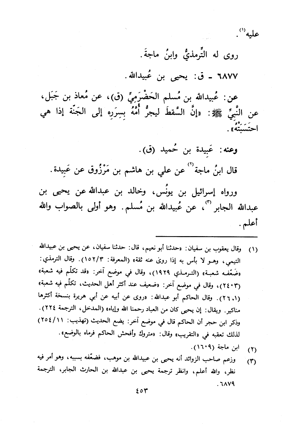 (6877 -) ق: يَحْيَى بن عُبَيد الله عَن: عُبَيد الله بْن مسلم الحضرمي (ق) ، عَنْ مُعَاذ بْن جبل، عَن النبي صَلَّى الله عليه وسلم: إن السقط ليجر أمه بسرره إِلَى الْجَنَّة إذا هي احتسبته.
