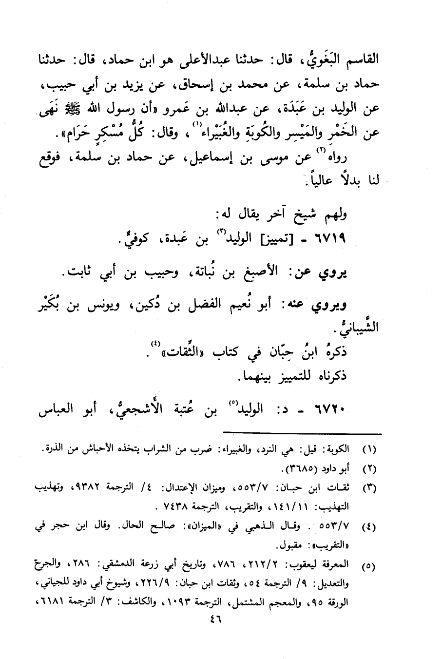 القاسم البغوي، قال: حَدَّثَنَا عبد الاعلى هُوَ ابْنُ حَمَّادٍ، قال: حَدَّثَنَا حَمَّادُ بْنُ سَلَمَةَ، عَنْ مُحَمَّدِ بْنُ إِسْحَاقَ، عَنْ يَزِيدَ بْنِ أَبي حَبِيبٍ، عَنِ الْوَلِيدِ بْنِ عَبْدَةَ، عَنْ عَبد اللَّهِ بْنِ عَمْرو" أَنَّ رَسُولَ اللَّهِ صَلَّى اللَّهُ عَلَيْهِ وسَلَّمَ نَهَى عَنِ الْخَمْرِ والْمَيْسِرِ والْكُوبَةِ والْغُبَيْرَاءِ (1) ، وَقَال: كُلُّ مُسْكِرٍ حَرَامٌ.