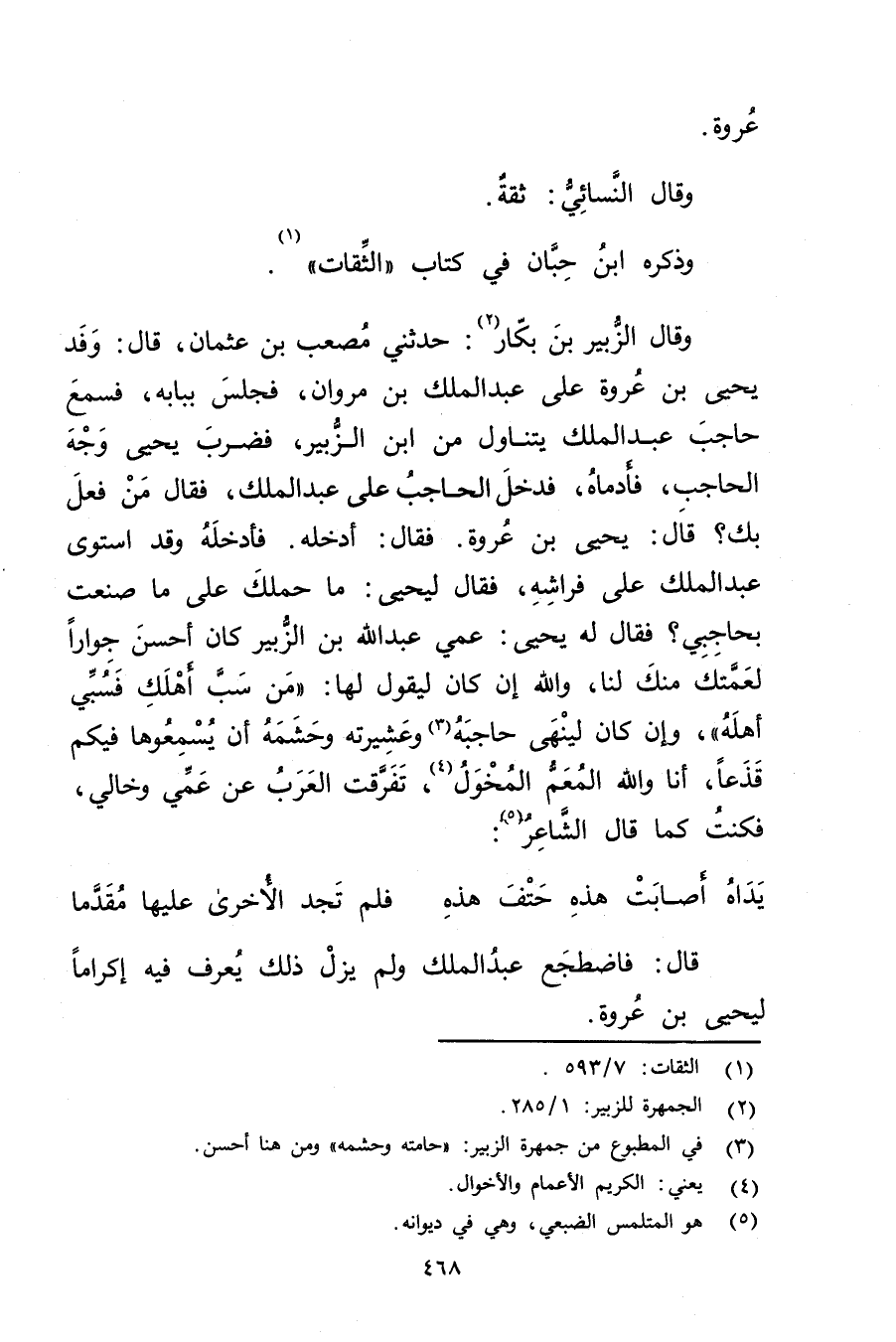 وَقَال الزُّبَيْر بن بكار (2) : حَدَّثَنِي مصعب بن عثمان، قال: وقد يَحْيَى بْن عروة على عَبد المَلِك بْن مَرَوَان، فجلس ببابه، فسمع حاجب عَبد المَلِك يتناول من ابْن الزبير، فضرب يَحْيَى وجه الحاجب، فأدماه، فدخل الحاجب على عَبد المَلِك، فَقَالَ من فعل بك؟ قال: يَحْيَى بْن عروة.