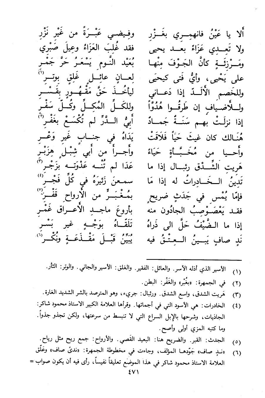 (4) الخادرات: هي الأسود التي في أجماتها. وقرأها العلامة الكبير الاستاذ محمود شاكر: الجاذيات، وشرحها بالابل السراع التي لا تنبسط من سرعتها، ولكن تجذو جذوا وما كتبه المزي أولى وأصح.