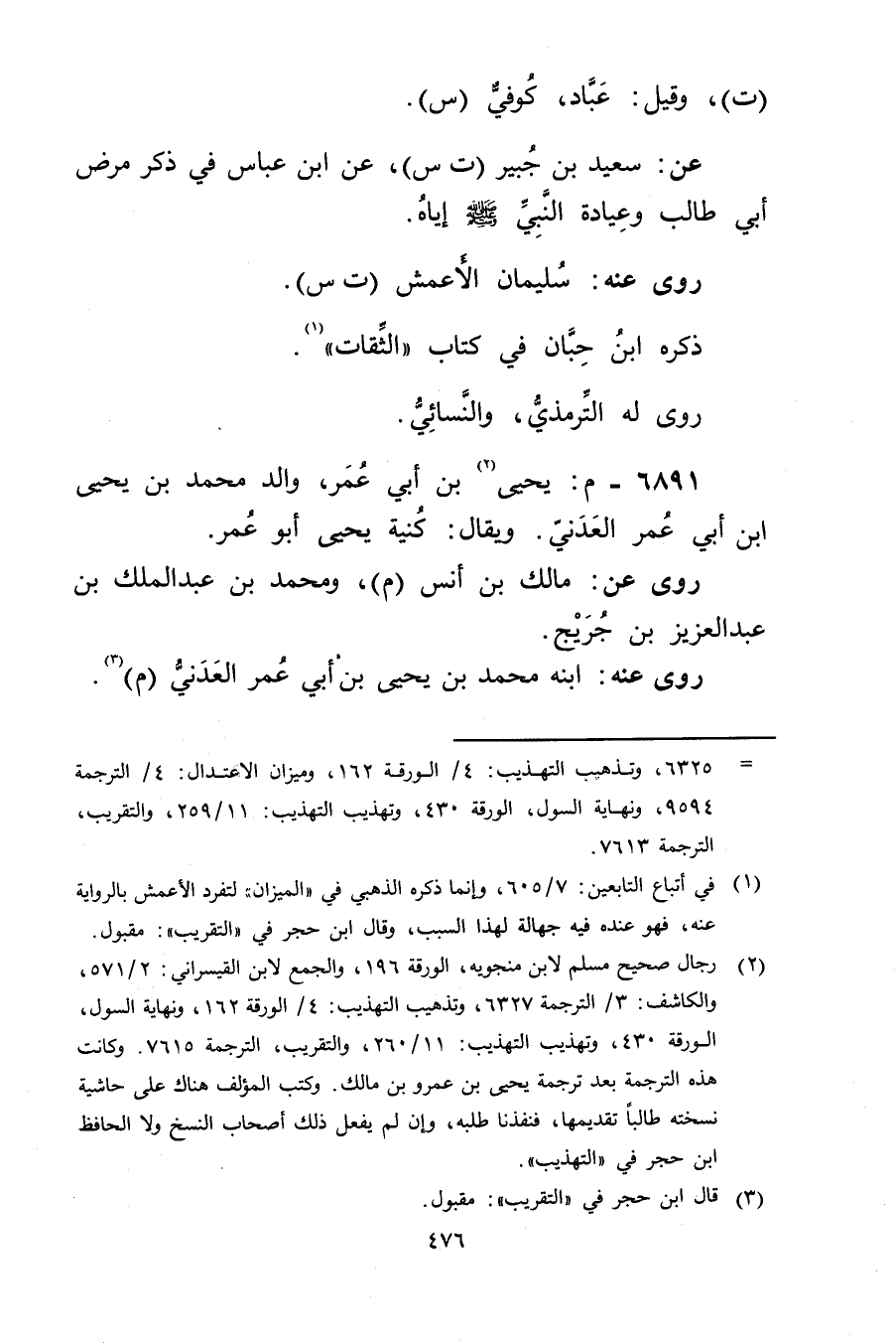 6891 - م: يَحْيَى بن أَبي عُمَر (2) ، والد محمد بن يحيى ابن أَبي عُمَر العدني، ويُقال: كنية يَحْيَى أَبُو عُمَر.