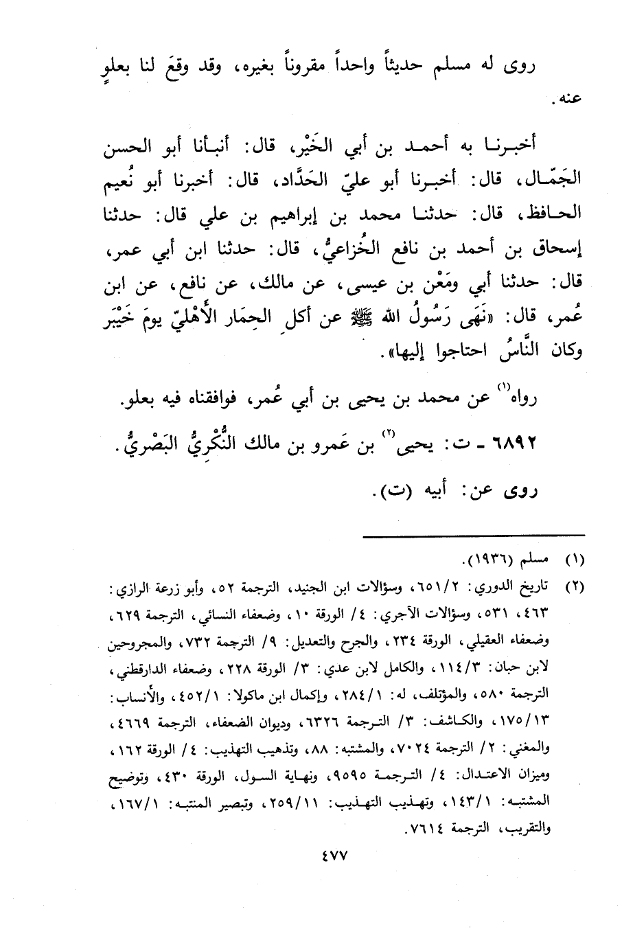 أَخْبَرَنَا بِهِ أَحْمَدُ بْن أَبي الخير، قال: أَنْبَأَنَا أَبُو الْحَسَنِ الجمال، قال: أَخْبَرَنَا أَبُو عَلِيّ الحداد، قال: أَخْبَرَنَا أَبُو نعيم الحافظ، قال: حَدَّثَنَا مُحَمَّدُ بْنُ إِبْرَاهِيمَ بْنِ عَلِيِّ قال: حَدَّثَنَا إِسْحَاقُ بْنُ أَحْمَدَ بْنِ نَافِعٍ الْخُزَاعِيُّ، قال: حَدَّثَنَا ابْنُ أَبي عُمَر، قال: حَدَّثَنَا أَبِي ومَعْنُ بْنُ عِيسَى، عَنْ مَالِك، عَنْ نَافِع، عَنِ ابْن عُمَر، قال: نَهَى رَسُولُ اللَّهِ صَلَّى اللَّهُ عَلَيْهِ وسَلَّمَ عَن أَكْلِ الْحِمَارِ الأَهْلِيِّ يَوْمَ خَيْبَرَ وكَانَ النَّاسُ احْتَاجُوا إِلَيْهَا.