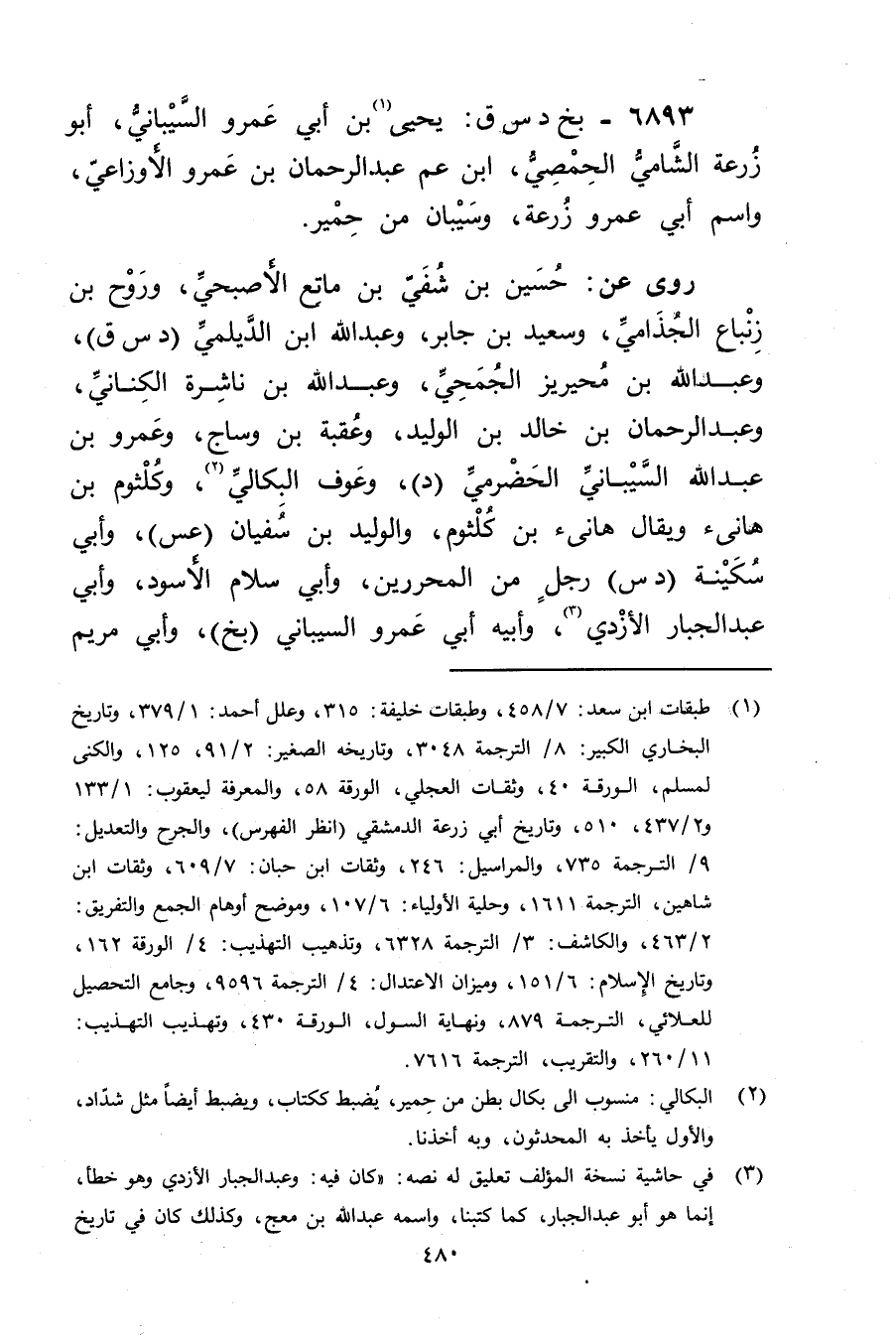 6893 - بخ د س ق: يَحْيَى بن أَبي عَمْرو السيباني (1) ، أَبُو زُرْعَة الشامي الحمصي، ابْن عم عَبْد الرحمن بْن عَمْرو الأَوزاعِيّ واسم أَبِي عَمْرو زرعة، وسيبان من حمير.