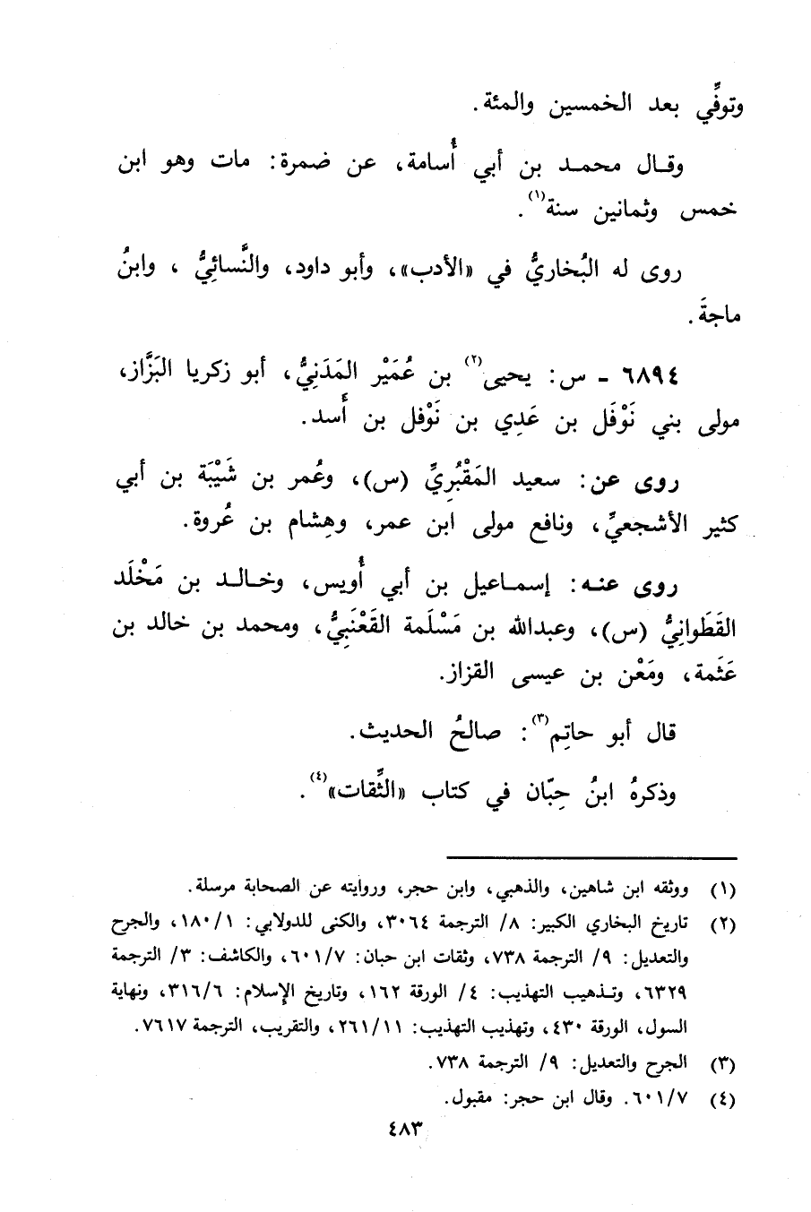 (2) تاريخ البخاري الكبير: 8 / الترجمة 3064، والكنى للدولابي: 1 / 180، والجرح والتعديل: 9 / الترجمة 738، وثقات ابن حبان: 7 / 601، والكاشف: 3 / الترجمة 6329، وتذهيب التهذيب: 4 / الورقة 162، وتاريخ الاسلام: 6 / 316، ونهاية السول، الورقة 430، وتهذيب التهذيب: 11 / 261، والتقريب، الترجمة 7617.