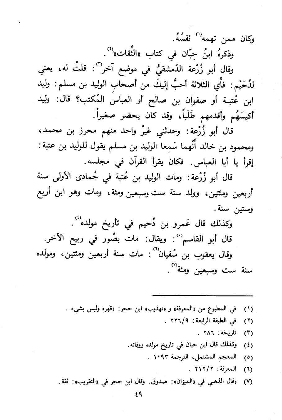 وَقَال أبو زُرْعَة الدمشقي في موضع آخر (3) : قلت له، يَعْنِي لدحيم: فأي الثلاثة أحب إليك من أصحاب الْوَلِيد بْن مسلم: وليد ابن عتبة أو صفوان بْن صَالِح أو العباس المكتب؟ قال: وليد أكيسهم وأقدمهم طلبا، وقد كَانَ يحضر صغيرا