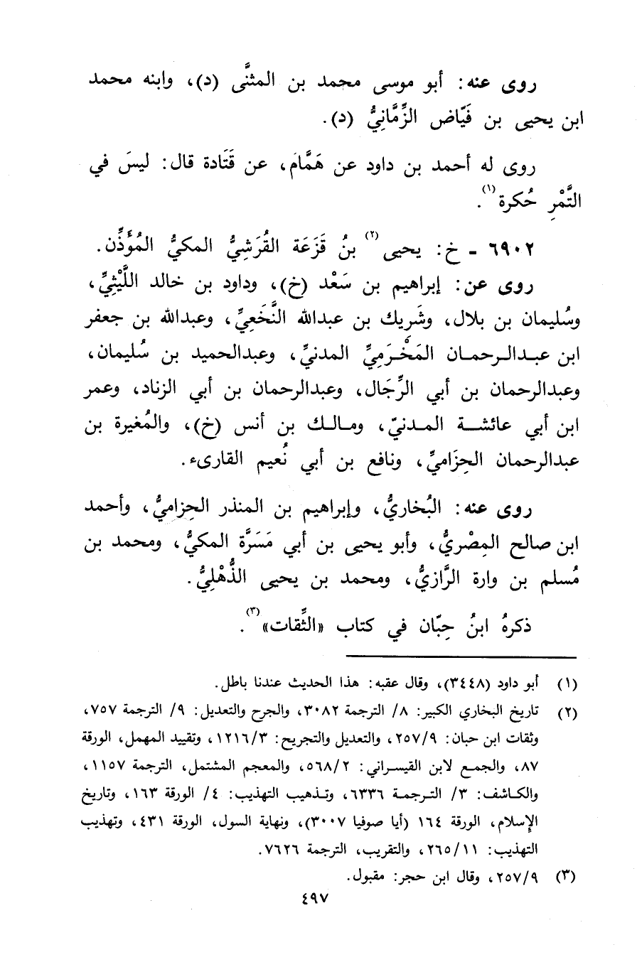 (2) تاريخ البخاري الكبير: 8 / الترجمة 3082، والجرح والتعديل: 9 / الترجمة 757 وثقات ابن حبان: 9 / 257، والتعديل والتجريح: 3 / 1216، وتقييد المهمل، الورقة 87، والجمع لابن القيسراني: 2 / 568، والمعجم المشتمل، الترجمة 1157، والكاشف: 3 / الترجمة 6336، وتذهيب التهذيب: 4 / الورقة 163، وتاريخ الاسلام، الورقة 164 (أيا صوفيا 3007) ، ونهاية السول، الورقة 431، وتهذيب التهذيب: 11 / 265، والتقريب، الترجمة 7626.