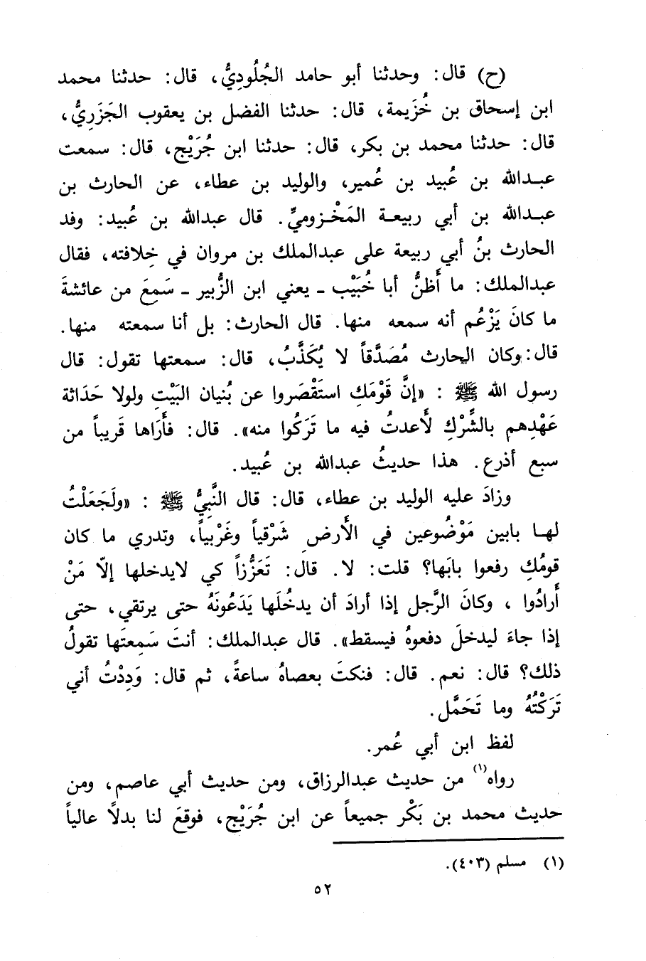 (ح) قال: وحَدَّثَنَا أبو حامد الجلودي، قال: حَدَّثَنَا محمد ابن إِسْحَاقَ بْنِ خُزَيْمَةَ، قال: حَدَّثَنَا الْفَضْلُ بْنُ يَعْقُوبَ الْجَزَرِيُّ، قال: حَدَّثَنَا مُحَمَّدُ بْنُ بَكْرٍ، قال: حَدَّثَنَا ابْنُ جُرَيْج، قال: سَمِعْتُ عَبد اللَّهِ بْن عُبَيد بْن عُمَير، والْوَلِيدَ بْنَ عَطَاءٍ، عَنِ الحارث بْن عَبد اللَّهِ بْن أَبي رَبِيعَةَ الْمَخْزُومِيِّ. قال عَبد اللَّهِ بْنُ عُبَيد: وفَدَ الْحَارِثُ بْنُ أَبي رَبِيعَةَ عَلَى عَبد المَلِك بْن مروان في خلافته، فَقَالَ عَبد المَلِك: مَا أَظُنُّ أَبَا خُبَيْبٍ، يَعْنِي ابْنَ الزُّبَيْرِ - سمع من عائشة ماكان يَزْعُمُ أَنَّهُ سَمِعَهُ مِنْهَا. قال الْحَارِثُ: بَلْ أَنَا سَمِعْتُهُ مِنْهَا قال: وكَانَ الْحَارِثُ مُصَدَّقًا لا يُكَذَّبُ، قال: سَمِعْتُهَا تَقُولُ: قال رَسُول اللَّهِ صلى الله عليه وسلم: إِنَّ قَوْمَكِ اسْتَقْصَرُوا عَنْ بُنْيَانِ الْبَيْتِ ولَوْلا حَدَاثَةُ عَهْدِهِمْ بِالشِّرْكِ لأَعَدْتُ فِيهِ مَا تَرَكُوا مِنْهُ" قال: فَأَرَاهَا قَرِيبًا مِنْ سَبَعِ أَذْرُعٍ.