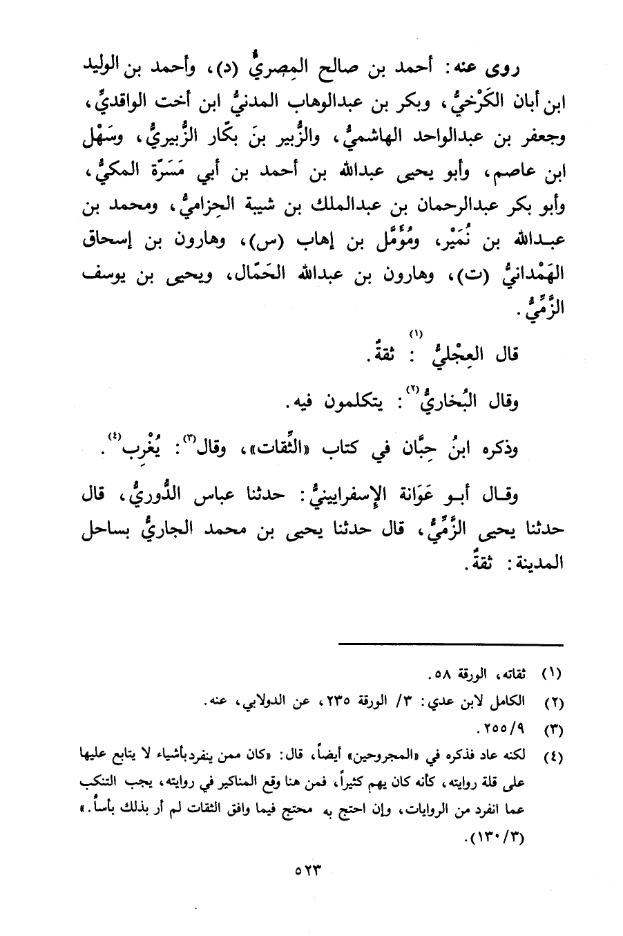 وَقَال أَبُو عوانة الإسفراييني: حَدَّثَنَا عَبَّاس الدوري، قال حَدَّثَنَا يَحْيَى الزمي، قال حَدَّثَنَا يَحْيَى بْنُ مُحَمَّدٍ الْجَارِيُّ بساحل المدينة: ثقة.