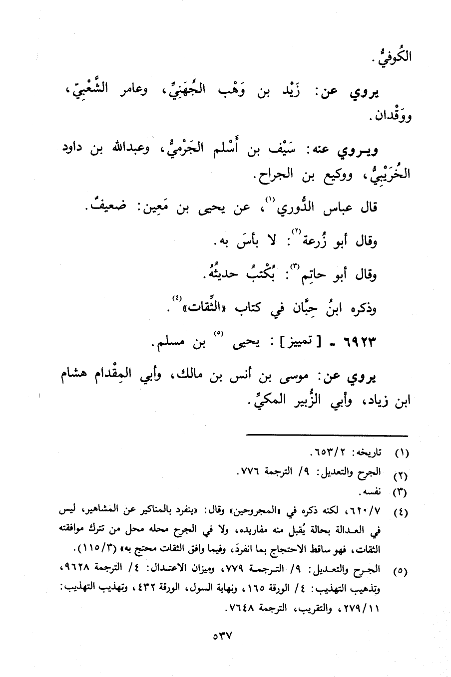 (5) الجرح والتعديل: 9 / الترجمة 779، وميزان الاعتدال: 4 / الترجمة 9628 وتذهيب التهذيب: 4 / الورقة 165، ونهاية السول، الورقة 432، وتهذيب التهذيب: 11 / 279، والتقريب، الترجمة 7648