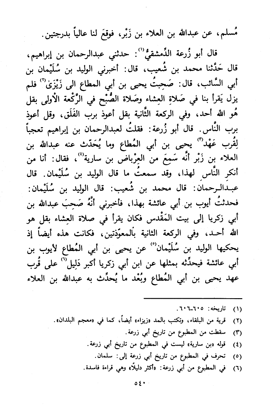 قال أَبُو زُرْعَة الدمشقي (1) : حَدَّثَنِي عَبْد الرَّحْمَنِ بن إِبْرَاهِيمَ، قال حَدَّثَنَا مُحَمَّدُ بْنُ شعيب، قال: أخبرني الْوَلِيد بْن سُلَيْمان بْن أَبي السائب، قال: صحبت يَحْيَى بْن أَبي المطاع إلى زيزى (2) فلم يزل يقرأ بنا فِي صلاة العشاء وصلاة الصبح في الركعة الأولى بقل هُوَ الله أحد، وفي الركعة الثانية بقل أعوذ برب الفلق، وقل أعوذ برب الناس قال أَبُو زُرْعَة: فقلت لعبد الرحمن بْن إِبْرَاهِيم تعجبا لقرب عهد (3) يَحْيَى بْن أَبي المطاع وما يحدث عنه عَبد اللَّهِ بْن العلاء بْن زبر أنه سمع من العرباض بْن سارية (4) ، فَقَالَ: أنا من أنكر الناس لهذا، وقد سمعت مَا قال الْوَلِيد بْن سُلَيْمان. قال عَبْد الرَّحْمَنِ: قال مُحَمَّد بْن شعيب: قال الْوَلِيد بْن سُلَيْمان: فحدثت أيوب بْن أَبي عَائِشَة بهذا، فأخبرني أنه صحب عَبد اللَّهِ بْن أَبي زكريا إلى بيت المقدس فَكَانَ يقرأ في صلاة العشاء بقل هُوَ الله أحد، وفي الركعة الثانية بالمعوذتين، فكانت هذه أيضا إذ يحكيها الْوَلِيد بْن سُلَيْمان (5) عَنْ يَحْيَى بْنِ أَبي الْمُطَاعِ لأيوب بْن أَبي عَائِشَة فيحدثه بمثلها عَنِ ابْن أَبي زكريا أكبر دليل (6) على قرب عهد يَحْيَى بْن أَبي المطاع وبعد مَا يحدث بِهِ عَبد اللَّهِ بن العلاء