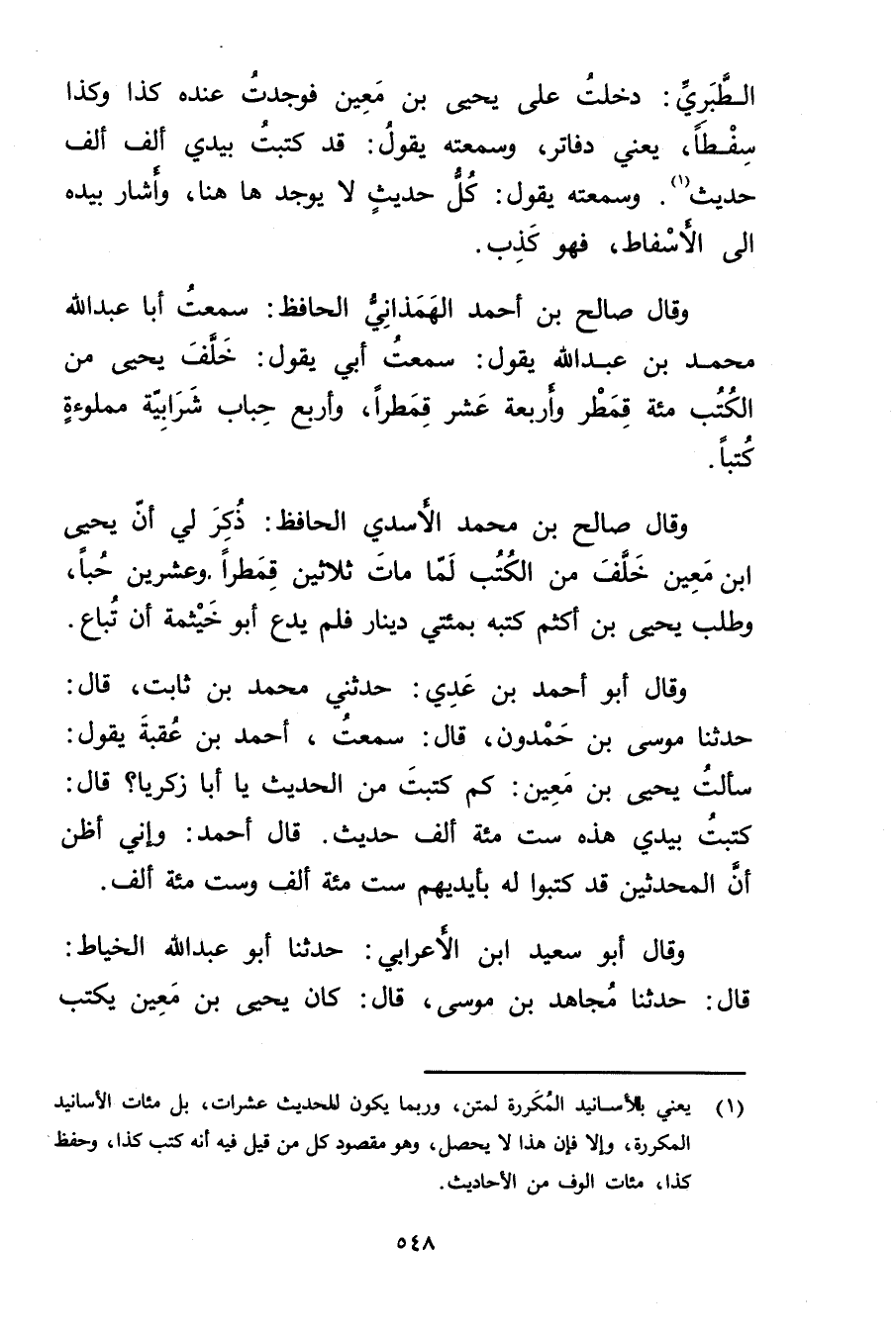 الطبري: دخلت على يَحْيَى بْن مَعِين فوجدت عنده كذا وكذا سفطا، يَعْنِي دفاتر، وسمعته يَقُول: قد كتبت بيدي ألف ألف حديث (1) وسمعته يَقُول: كل حديث لا يوجد ها هنا، وأشار بيده إلى الأسفاط، فهو كذب.