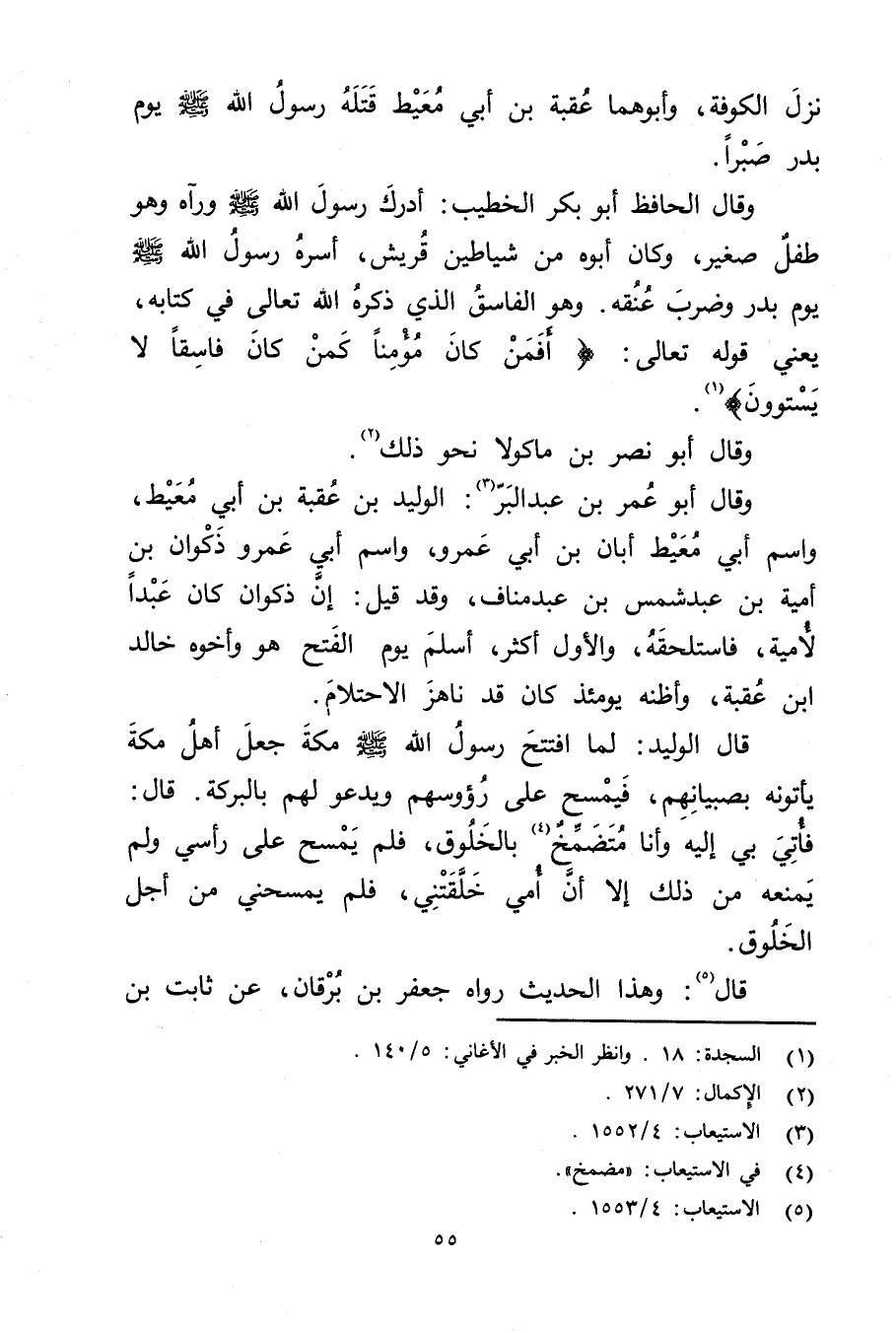 وَقَال الْحَافِظ أَبُو بَكْر الخطيب: أدرك رَسُول اللَّهِ صَلَّى اللَّهُ عَلَيْهِ وسَلَّمَ ورآه وهُوَ طفل صغير، وكَانَ أبوه من شياطين قريش، أسره رَسُول اللَّهِ صلى الله عليه وسلم يوم بدر وضرب عنقه، وهُوَ الفاسق الذي ذكره الله تعالى فِي كتابه، يَعْنِي قوله تعالى: (أفمن كَانَ مؤمنا كمن كَانَ فاسقا لا يستوون) (1) .