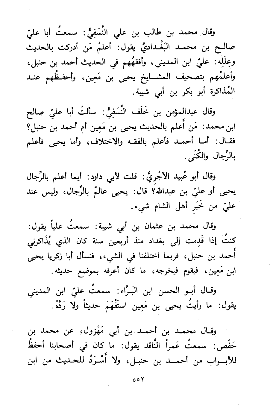 وَقَال مُحَمَّد بْن عثمان بْن أَبي شَيْبَة: سمعت عليا يَقُول: كنت إذا قدمت إلى بغداد منذ أربعين سنة كَانَ الذي يذاكرني أَحْمَد بْن حَنْبَل، فربما اختلفنا في الشئ، فنسأل أبا زكريا يحيى ابن مَعِين، فيقوم فيخرجه، مَا كَانَ أعرفه بموضع حديثه.