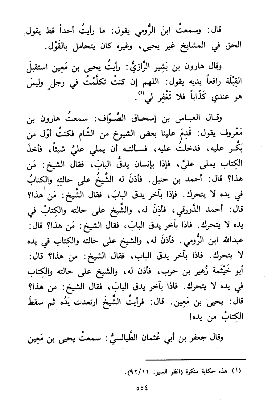 وَقَال العباس بْن إِسْحَاق الصواف: سمعت هَارُون بْن مَعْرُوف يَقُول: قدم علينا بعض الشيوخ من الشام فكنت أول من بَكْر عليه، فدخلت عليه، فسألته أن يملي علي شيئا، فأخذ الكتاب يملى علي، فإذا بإنسان يدق الباب، فَقَالَ الشيخ: من هذا؟ قال: أَحْمَد بْن حَنْبَل. فأذن له الشيخ على حالته والكتاب فِي يده لا يتحرك. فإذا بآخر يدق الباب، فَقَالَ الشيخ: من هذا؟ قال: أَحْمَد الدورقي، فأذن له، والشيخ على حالته والكتاب فِي يده لا يتحرك. فإذا بآخر يدق الباب، فَقَالَ الشيخ: من هَذَا؟ قال: عَبد اللَّهِ بْنُ الرومي. فأذن له، والشيخ على حالته والكتاب فِي يده لا يتحرك. فإذا بآخر يدق الباب، فَقَالَ الشيخ: من هذا؟ قال: أَبُو خيثمة زهير بْن حرب، فأذن له، والشيخ على حالته والكتاب فِي يده لا يتحرك. فإذا بآخر يدق الباب، فَقَالَ الشيخ من هذا؟ قال: يَحْيَى بْن مَعِين. قال: فرأيت الشيخ ارتعدت يده ثُمَّ سقط الكتاب من يده!