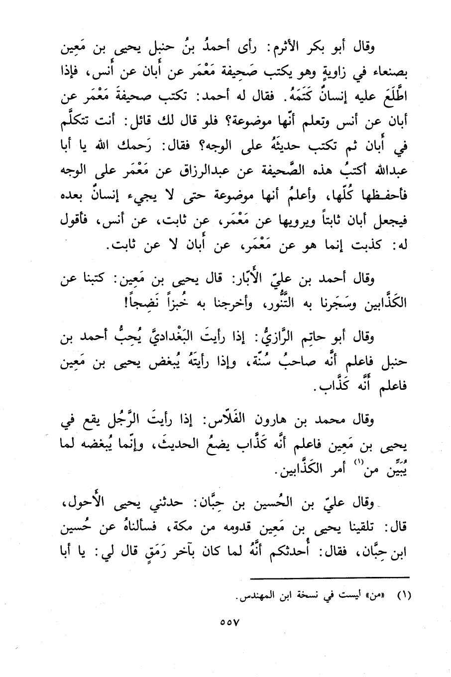 وَقَال أَبُو حاتم الرازي: إذا رأيت البغدادي يحب أَحْمَد بْن حَنْبَل فاعلم أنه صاحب سنة، وإذا رأيته يبغض يَحْيَى بْن مَعِين فاعلم أنه كذاب.