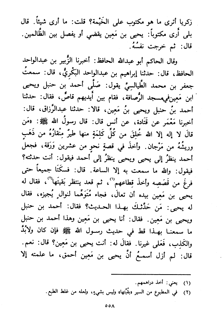 وَقَال الحاكم أَبُو عَبْد اللَّهِ الْحَافِظ: أخبرنا الزبير بْن عَبْد الْوَاحِدِ الْحَافِظ، قال: حَدَّثَنَا إِبْرَاهِيم بْن عَبْد الْوَاحِدِ البكري، قال: سمعت جَعْفَر بْن مُحَمَّد الطيالسي يَقُول: صَلَّى أَحْمَد بن حنبل ويحيى ابن مَعِين فِي مسجد الرصافة، فقام بين أيديهم قاص، فَقَالَ: حَدَّثَنَا أَحْمَد بْن حنبل ويحيى بْن مَعِين، قالا: حَدَّثَنَا عَبْدُ الرَّزَّاقِ، قال: أَخْبَرَنَا مَعْمَرٌ عَنْ قَتَادَةَ، عَنْ أَنَسٍ قال: قال رَسُولُ اللَّهِ صلى الله عليه وسلم: من قال لا إله إلا الله خلق من كل كلمة منها طير منقاره من ذهب وريشه من مرجان، وأخذ فِي قصة نحو من عشرين ورقة، فجعل أَحْمَد ينظر إلى يَحْيَى ويحيى ينظر إلى أَحْمَد فيقول: أنت حدثته؟ فيقول: والله مَا سمعت بِهِ إلا الساعة. قال: فسكتا جميعا حَتَّى فرغ من قصصه وأخذ قطاعهم (1) ، ثُمَّ قعد ينتظر بقيتها (2) ، فَقَالَ له يَحْيَى بْن مَعِين بيده أن تعال، فجاء متوهما لنوال يجيزه، فَقَالَ له يَحْيَى: من حدثك بهذا الحديث؟ فَقَالَ: أَحْمَد بْن حَنْبَل ويحيى بْن مَعِين. فَقَالَ: أنا يَحْيَى بْن مَعِين وهذا أَحْمَد بْن حَنْبَل مَا سمعنا بهذا قط فِي حديث رَسُول اللَّهِ صلى الله عليه وسلم فَإِنَّ كان ولابد والكذب، فعلى غيرنا. فَقَالَ له: أنت يَحْيَى بْن مَعِين؟ قال: نعم قال: لم أزل أسمع أن يَحْيَى بْن مَعِين أحمق، ما علمته إلا