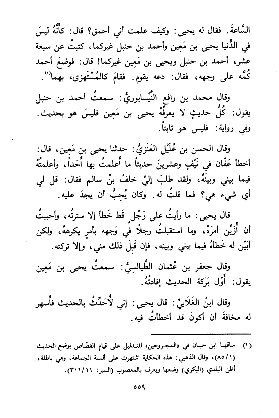 الساعة. فَقَالَ له يَحْيَى: وكيف علمت أني أحمق؟ قال: كأنه ليس فِي الدنيا يَحْيَى بْن مَعِين وأَحْمَد بْن حَنْبَل غيركما، كتبت عَنْ سبعة عشر، أَحْمَد بْن حنبل ويحيى بْن مَعِين غيركما! قال: فوضع أَحْمَد كمه على وجهه، فَقَالَ: دعه يقوم. فقام كالمستهزئ بهما (1) .