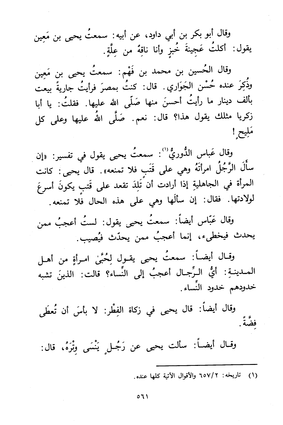 وَقَال الْحُسَيْن بْن مُحَمَّد بْن فهم: سمعت يَحْيَى بْن مَعِين وذكر عنده حسن الجواري. قال: كنت بمصر فرأيت جارية بيعت بألف دينار مَا رأيت أحسن منها صَلَّى الله عليها. فقلت يا أَبَا زكريا مثلك يَقُول هذا؟ قال: نعم. صَلَّى الله عليها وعلى كل مليح!