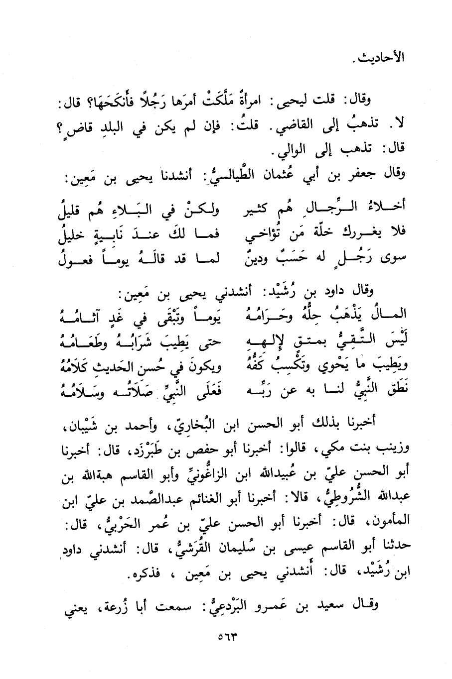 أخبرنا بذلك أبو الحسن بْن البخاري، وأحمد بْن شَيْبَانَ: وزينب بنت مَكِّيٍّ، قَالُوا: أَخْبَرَنَا أَبُو حَفْصٍ بن طَبَرْزَذَ، قال: أَخْبَرَنَا أَبُو الْحَسَن علي بْنُ عُبَيد اللَّهِ بْنِ الزَّاغَوَنِيِّ وأَبُو الْقَاسِمِ هِبَةُ اللَّهِ بْنُ عَبد اللَّهِ الشَّرُوطِيُّ، قَالا: أخبرنا أَبُو الْغَنَائِمِ عَبْدُ الصَّمَدِ بْنُ علي ابن الْمَأْمُونِ، قال: أَخْبَرَنَا أَبُو الْحَسَنِ علي بْن عُمَر الْحَرْبِيّ، قال: حَدَّثَنَا أَبُو الْقَاسِمِ عِيسَى بْنُ سُلَيْمان القرشي، قال: أنشدني داود ابن رشيد، قال: أنشدني يَحْيَى بْن مَعِين، فذكره.