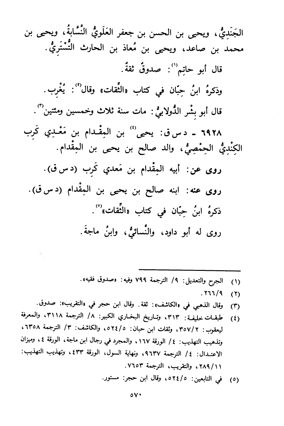(4) طبقات خليفة: 313، وتاريخ البخاري الكبير: 8 / الترجمة 3118، والمعرفة ليعقوب: 2 / 357، وثقات ابن حبان: 5 / 524، والكاشف: 3 / الترجمة 6358 وتذهيب التهذيب: 4 / الورقة 167، والمجرد في رجال ابن ماجة، الورقة 4، وميزان الاعتدال: 4 / الترجمة 9637، ونهاية السول، الورقة 433، وتهذيب التهذيب: 11 / 289، والتقريب، الترجمة 7653