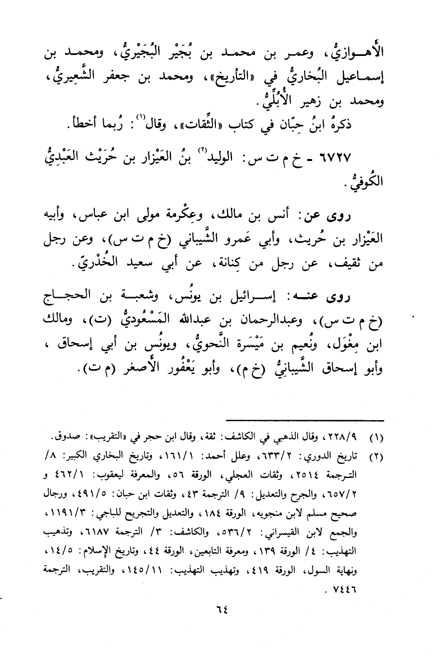 (2) تاريخ الدوري: 2 / 633، وعلل أحمد: 1 / 161، وتاريخ البخاري الكبير: 8 / الترجمة 2514، وثقات العجلي، الورقة 56، والمعرفة ليعقوب: 1 / 462 و2 / 657، والجرح والتعديل: 9 / الترجمة 43، وثقات ابن حبان: 5 / 491، ورجال صحيح مسلم لابن منجويه، الورقة 184، والتعديل والتجريح للباجي: 3 / 1191، والجمع لابن القيسراني: 2 / 536، والكاشف: 3 / الترجمة 6187، وتذهيب التهذيب: 4 / الورقة 139، ومعرفة التابعين، الورقة 44، وتاريخ الاسلام: 5 / 14، ونهاية السول، الورقة 419، وتهذيب التهذيب: 11 / 145، والتقريب، الترجمة 7446