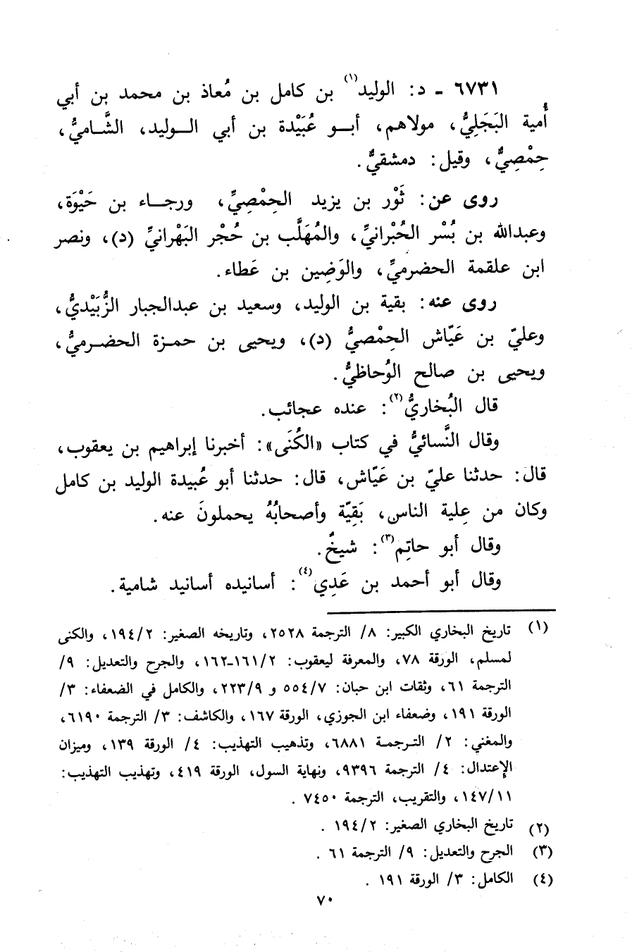 6731 - د: الْوَلِيد بن كَامِل بن معاذ بْن مُحَمَّد بْن أَبي أمية البجلي (1) ، مولاهم، أَبُو عُبَيدة بْن أَبي الْوَلِيد، الشامي، حمصي، وقيل: دمشقي.