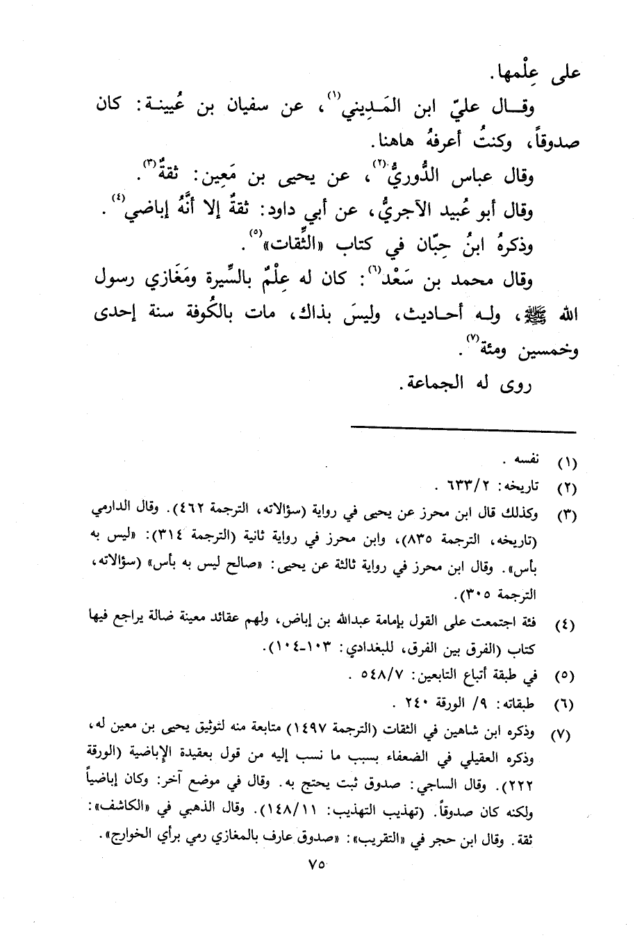 (7) وذكره ابن شاهين في الثقات (الترجمة 1497) متابعة منه لتوثيق يحيى بن مَعِين له، وذكره العقيلي في الضعفاء بسبب ما نسب إليه من قول بعقيدة الاباضية (الورقة 222) .