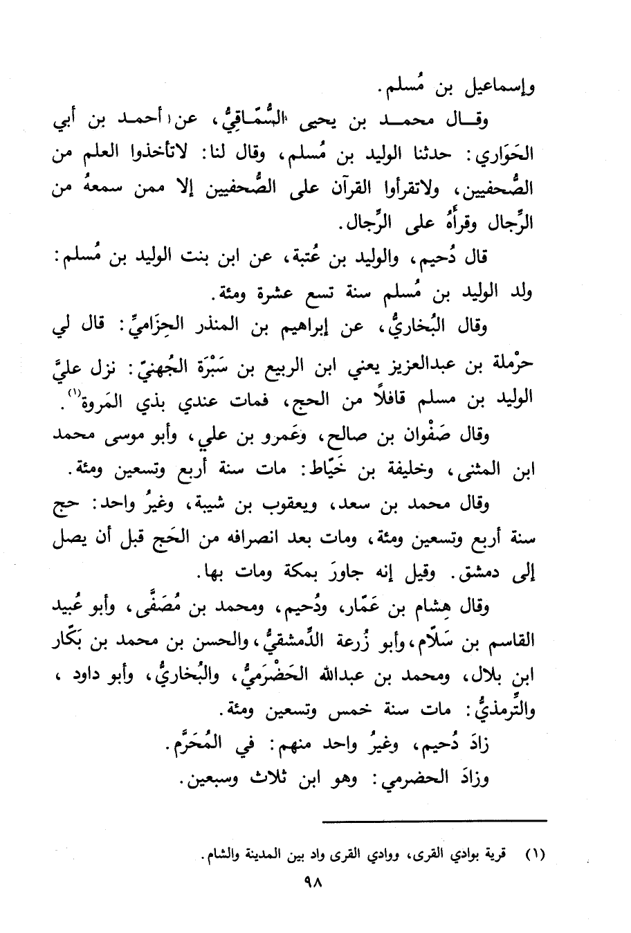 وقَال البُخارِيُّ، عَنْ إِبْرَاهِيم بْن المنذر الحزامي: قال لي حرملة بْن عَبْد الْعَزِيزِ يَعْنِي ابْن الربيع بْن سبرة الجهني: نزل علي الْوَلِيد بْن مسلم قافلا من الحج، فمات عندي بذي المروة (1) .