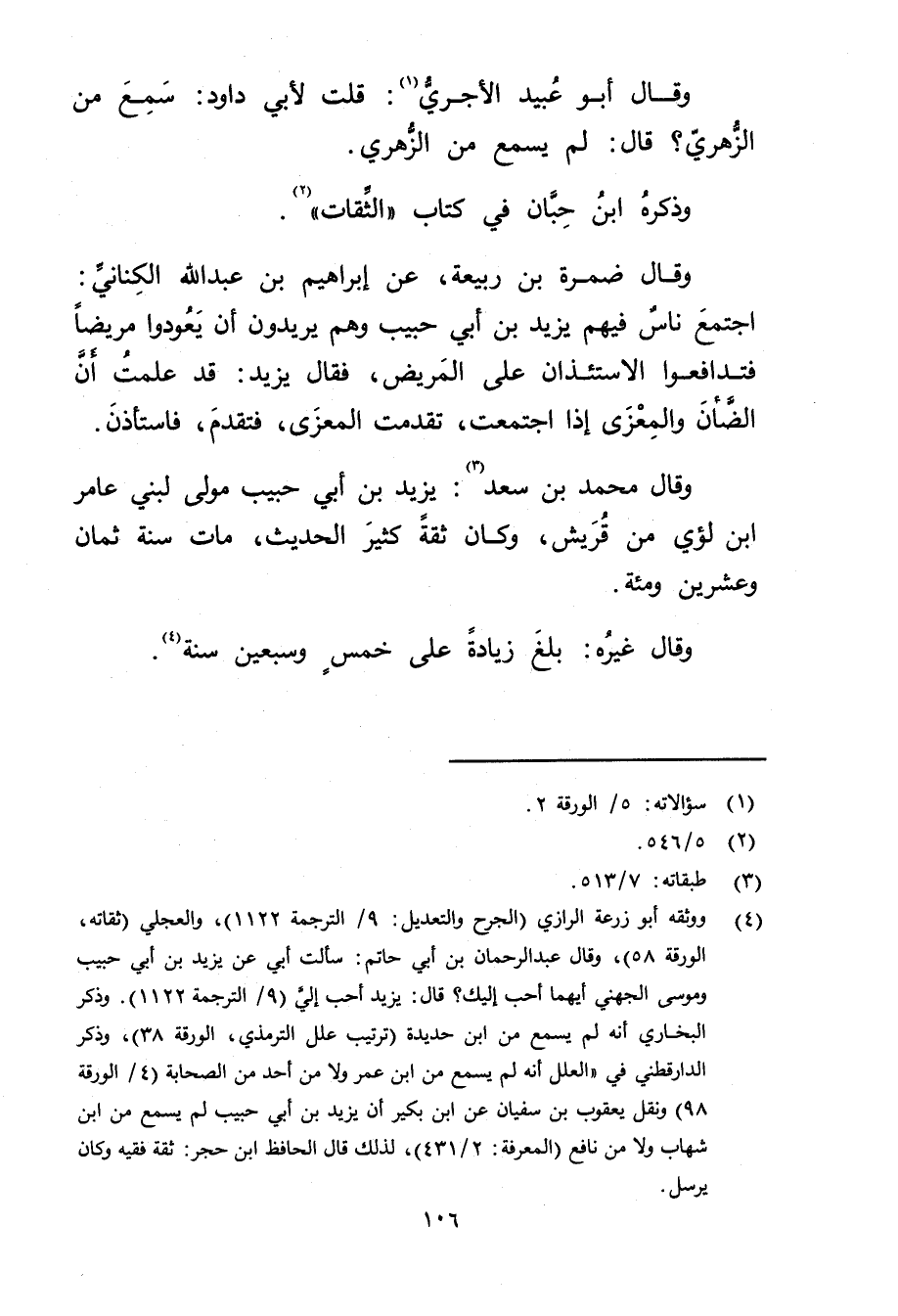 (4) ووثقه أبو زُرْعَة الرازي (الجرح والتعديل: 9 / الترجمة 1122) ، والعجلي (ثقاته، الورقة 58) ، وَقَال عَبْد الرَّحْمَنِ بْن أَبي حاتم: سَأَلتُ أبي عَنْ يزيد بْن أَبي حبيب وموسى الجهني أيهما أحب إليك؟ قال: يزيد أحب إلي (9 / الترجمة 1122) . وذكر البخاري إنه لم يسمع من ابْن حديدة (ترتيب علل التِّرْمِذِيّ، الورقة 38) ، وذكر الدارقطني في " العلل إنه لم يسمع من ابْن عُمَر ولا من أحد من الصحابة (4 / الورقة 98) ونقل يعقوب بن سفيان عن ابن بكير أن يزيد بن أَبي حبيب لم يسمع من ابن شهاب ولا من نافع (المعرفة: 2 / 431) ، لذلك قال الحافظ ابن حجر: ثقة فقيه وكان يرسل.