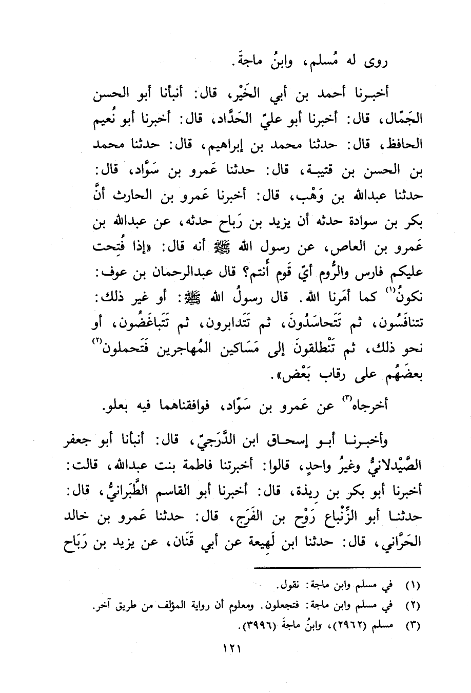أَخْبَرَنَا أَحْمَد بْن أَبي الخير، قال: أَنْبَأَنَا أَبُو الْحَسَنِ الْجَمَّالُ، قال: أَخْبَرَنَا أَبُو عَلِيّ الحداد، قال: أَخْبَرَنَا أَبُو نُعَيْمٍ الْحَافِظُ، قال: حَدَّثَنَا مُحَمَّدُ بْنُ إِبْرَاهِيمَ، قال: حَدَّثَنَا مُحَمَّدُ بْنُ الْحَسَنِ بْنِ قُتَيْبَةَ، قال: حَدَّثَنَا عَمْرو بْنُ سَوَّادٍ، قال: حَدَّثَنَا عَبد اللَّهِ بْنُ وهْبٍ، قال: أخبرنا عَمْرو بْنُ الْحَارِثِ أَنَّ بَكْرَ بْنَ سَوَّادَةَ حَدَّثَهُ أَنَّ يَزِيدَ بْنَ رَبَاحٍ حَدَّثَهُ، عَنْ عَبْدِ الله بْن عَمْرو بْن العاص، عن رَسُولِ اللَّهِ صَلَّى اللَّهُ عليه وسلم أَنَّهُ قال: إِذَا فُتِحَتْ عَلَيْكُمْ فَارِسُ والرُّومُ أَيُّ قَوْمٍ أَنْتُمْ؟ قال عَبْدُ الرَّحْمَنِ بْنُ عَوْفٍ: نَكُونُ (1) كَمَا أَمَرَنَا اللَّهِ. قال رَسُولُ اللَّهِ صَلَّى الله عليه وسلم: أَوْ غَيْرَ ذَلِكَ: تَتَنَافَسُونَ، ثُمَّ تَتَحَاسَدُونَ، ثُمَّ تَتَدَابَرُونَ، ثُمَّ تَتَبَاغَضُونَ، أَوْ نَحْوَ ذَلِكَ، ثُمَّ تَنْطَلِقُونَ إِلَى مَسَاكِينَ الْمُهَاجِرِينَ فَتَحْمِلُونَ (2) بَعْضَهُمْ عَلَى رِقَابِ بَعْضٍ.
