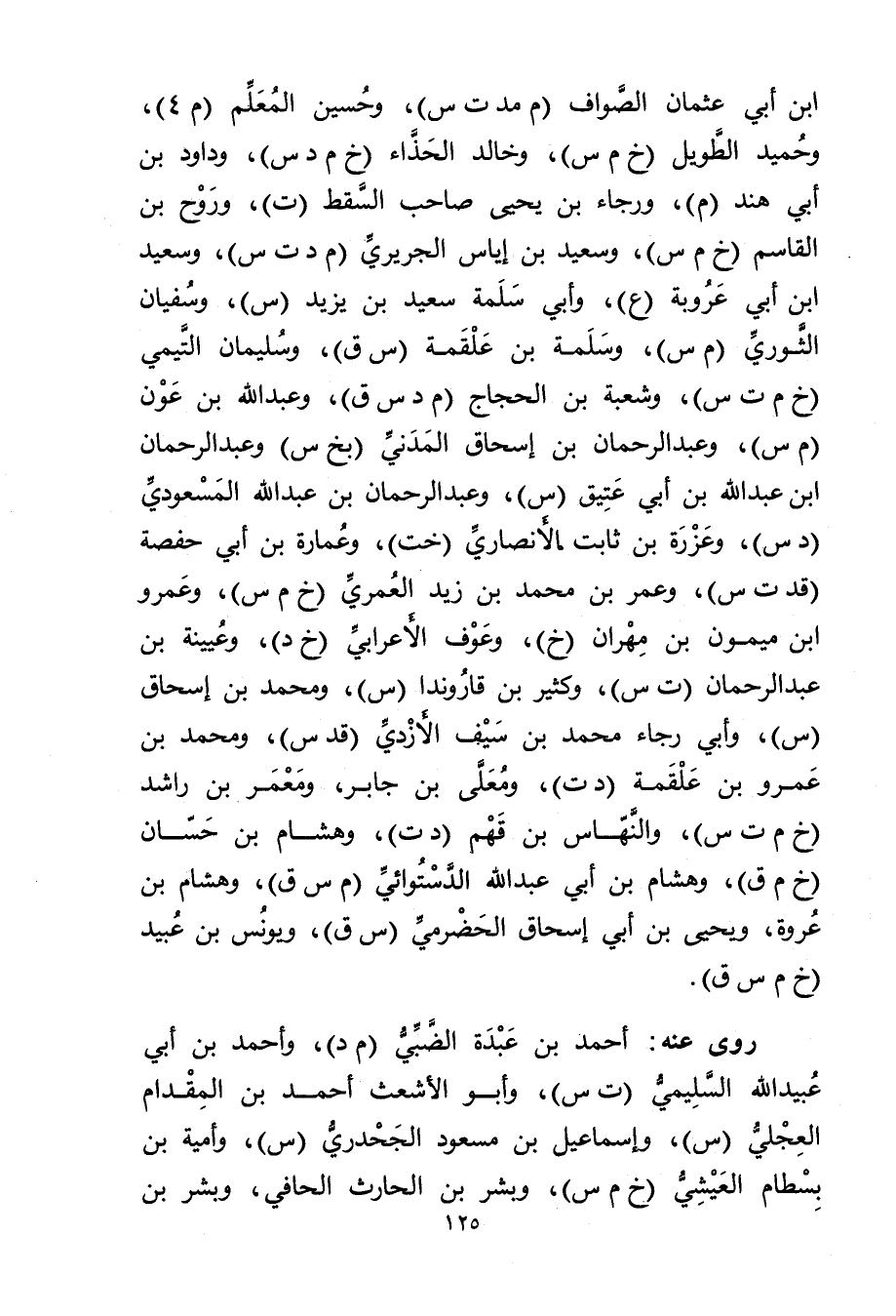 ابن أَبي عثمان الصواف (م مد ت س) ، وحسين المعلم (م 4) ، وحميد الطويل (خ م س) ، وخالد الحذاء (خ م د س) ، وداود بْن أَبي هند (م) ، ورجاء بْن يحيى صاحب السقط (ت) ، وروح بْن القاسم (خ م س) ، وسَعِيد بْن إياس الجريري (م د ت س) ، وسَعِيد ابن أَبي عَرُوبَة (ع) ، وأبي سلمة سَعِيد بْن يزيد (س) ، وسفيان الثوري (م س) ، وسلمة بْن علقمة (س ق) ، وسُلَيْمان التَّيْمِيّ (خ م ت س) ، وشعبة بْن الحجاج (م د س ق) ، وعَبد الله بْن عون
