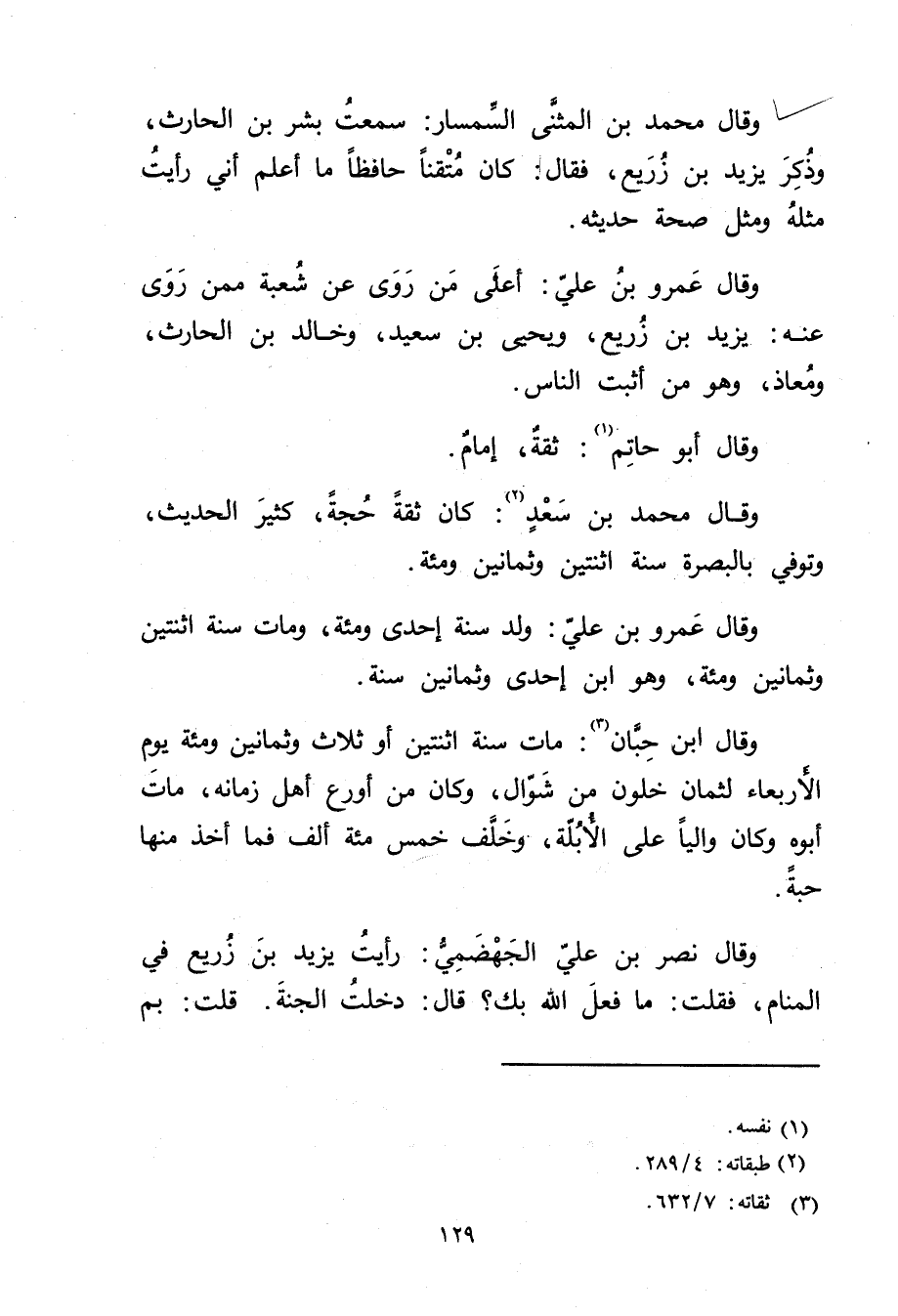 وَقَال مُحَمَّد بْن المثنى السمسار: سمعت بشر بْن الحارث، وذكر يزيد بْن زريع، فقال: كَانَ متقنا حافظا ما أعلم إني رأيت مثله ومثل صحة حديثه.