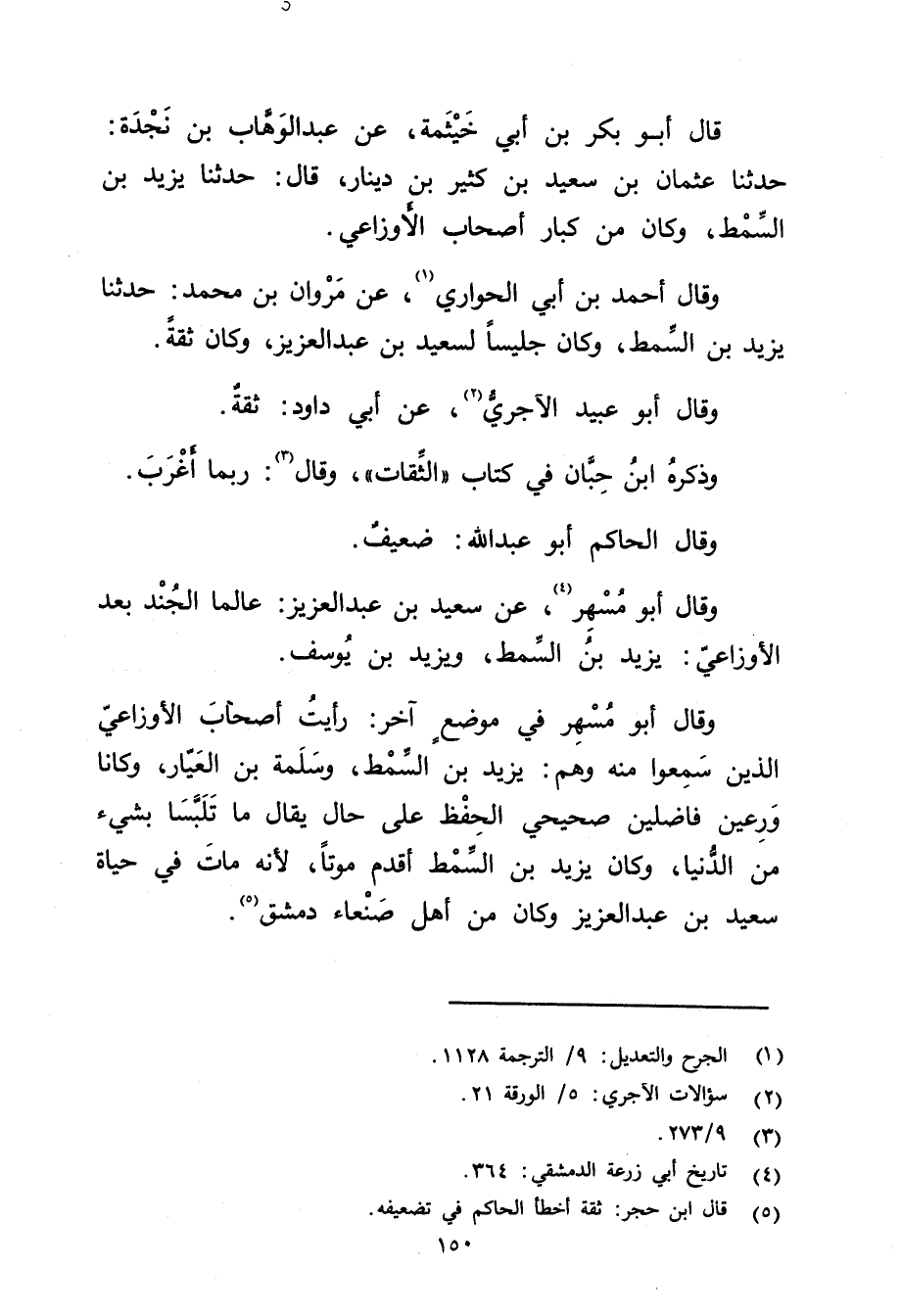 قال أبو بكر بْن أَبي خيثمة، عَن عَبْد الوهاب بْن نجدة: حَدَّثَنَا عثمان بْن سَعِيد بْنِ كَثِيرِ بْنِ دِينَارٍ، قال: حَدَّثَنَا يزيد بْن السمط، وكان من كبار أصحاب الأَوزاعِيّ.
