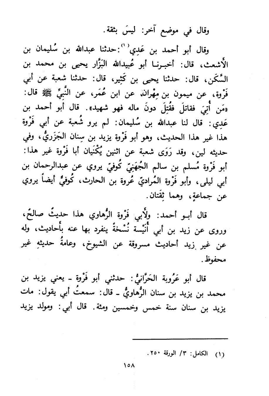 وَقَال أَبُو أَحْمَد بْن عَدِيٍّ (1) : حَدَّثَنَا عَبد اللَّهِ بْنُ سُلَيْمان بْنِ الأَشْعَثِ، قال: أخبرنا أَبُو عُبَيد اللَّهِ الْبَزَّارُ يَحْيَى بْن مُحَمَّدِ بْن السكن، قال: حَدَّثَنَا يَحْيَى بْن كثير، قال: حَدَّثَنَا شُعْبَةُ عَن أَبِي فَرْوَةَ، عَنْ مَيْمُونَ بْنِ مِهْرَانَ، عَنِ ابْن عُمَر، عَنِ النَّبِيِّ صَلَّى اللَّهُ عليه وسلم قال: من أُتِيَ فَقَاتَلَ فَقُتِلَ دُونَ مَالِهِ فَهُوَ شَهِيدٌ". قال أَبُو أَحْمَدَ بْنُ عَدِيٍّ: قال لَنَا عَبْدُ اللَّهِ بْنُ سُلَيْمان: لَمْ يَرْوِ شُعْبَةُ عَن أَبِي فَرْوَةَ هَذَا غَيْرَ هَذَا الْحَدِيثِ، وهُوَ أَبُو فروة يزيد بن سنان الجزري، وفِي حَدِيثِهِ لِينٌ، وقَدْ رَوَى شُعْبَةُ عَنِ اثْنَيْنِ يُكَنَّيَانِ أَبَا فَرْوَةَ غَيْرَ هَذَا: أَبُو فَرْوَةَ مُسْلِمُ بْنُ سَالِمٍ الْجُهَنِيُّ كُوفِيٌّ يروى عن عَبْد الرَّحْمَن بْن أَبِي لَيْلَى، وأَبُو فَرْوَةَ الْمُرَادِيُّ عُرْوَةُ بْنُ الْحَارِثِ، كُوفِيٌّ أَيْضًا يَرْوِي عَنْ جَمَاعَةٍ، وهُمَا ثِقَتَانِ.