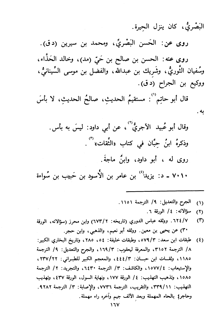 (3) 7 / 624. ووثقه عباس الدوري (تاريخه: 2 / 673) وابن محرز (سؤالاته، الورقة 30) عن يحيى بن مَعِين. ووثقه أبو نعيم، والذهبي، وابن حجر.