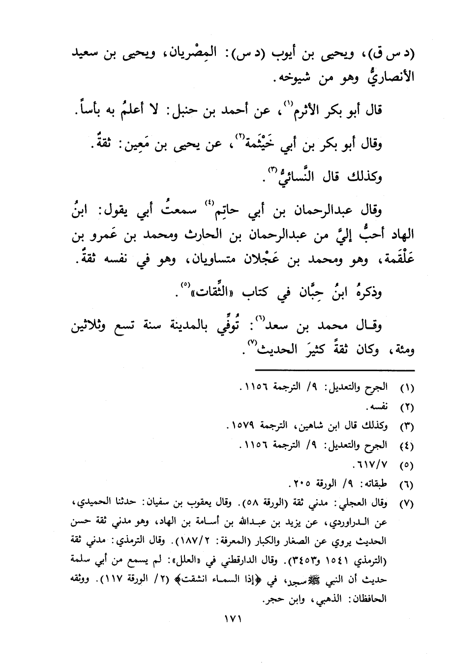 (7) وَقَال العجلي: مدني ثقة (الورقة 58) . وَقَال يعقوب بْن سفيان: حَدَّثَنَا الحميدي، عن الدَّراوَرْدِيّ، عَن يزيد بْن عَبد الله بْن أسامة بْن الهاد، وهو مدني ثقة حسن الحديث يروي عن الصغار والكبار (المعرفة: 2 / 187) . وَقَال التِّرْمِذِيّ: مدني ثقة (التِّرْمِذِيّ 1541 و3453) . وَقَال الدَّارَقُطْنِيُّ في " العلل": لم يسمع من أبي سلمة حديث أن النبي صلى الله عليه وسلم سجد، في (إذا السماء انشقت) (2 / الورقة 117) . ووثقه الحافظان: الذهبي، وابن حجر.