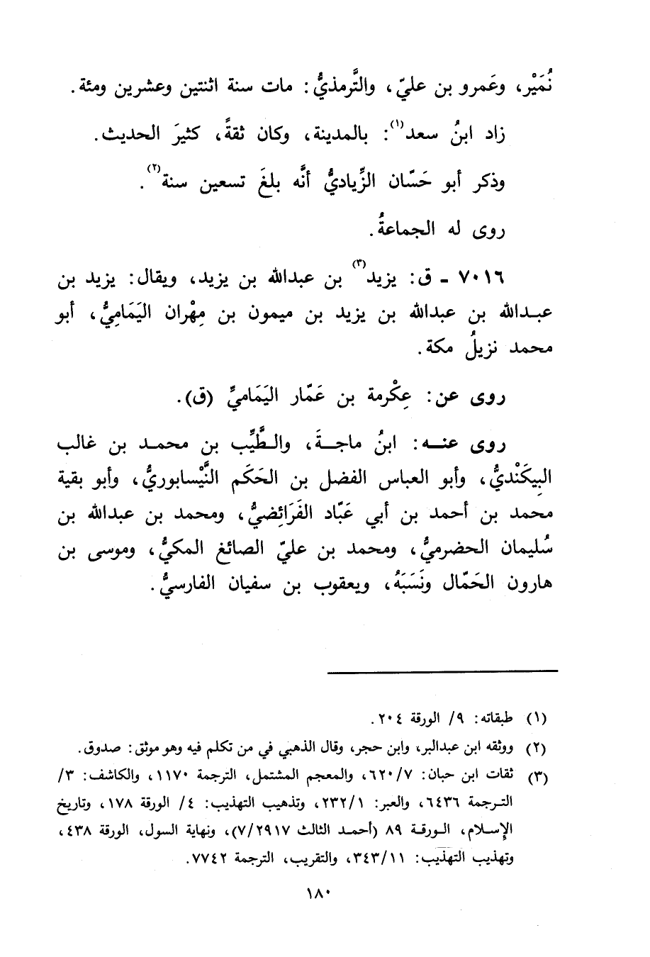 (3) ثقات ابن حبان: 7 / 620، والمعجم المشتمل، الترجمة 1170، والكاشف: 3 / الترجمة 6436، والعبر: 1 / 232، وتذهيب التهذيب: 4 / الورقة 178، وتاريخ الاسلام، الورقة 89 (أحمد الثالث 2917 / 7) ، ونهاية السول، الورقة 438، وتهذيب التهذيب: 11 / 343، والتقريب، الترجمة 7742.